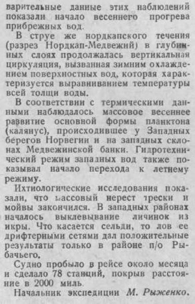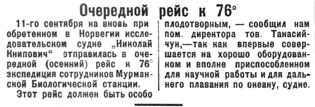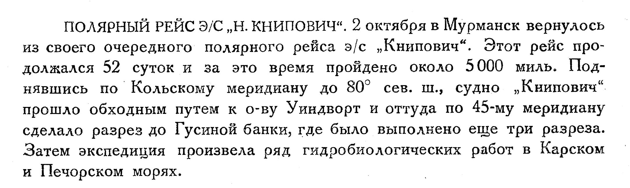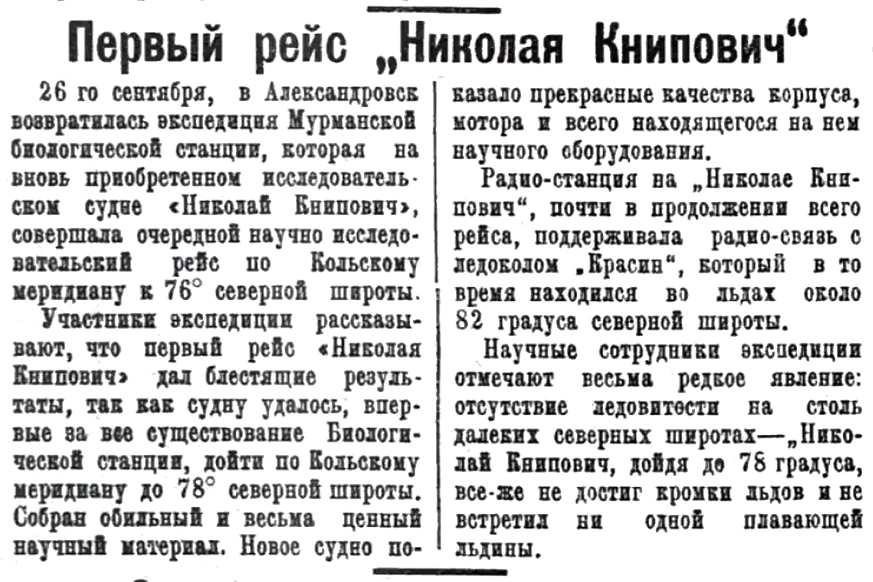 Участник! экспедиции рассказывают, что первый рейс "Николая Книпович" дал блестящие результаты, так как судну удалось, впервые ва все существование Биологической станции, дойти по Кольскому меридиану до 78° северной широты. Собран обильный и весьма ценный научный материал. Новое судно показало прекрасные качества корпуса, мотора и всего находящегося ва нем научного оборудования.