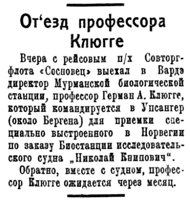 Вчера с рейсовым п/х Совторгфлота «Сосновец» выехал в Вардэ директор Мурманской биологической станции, профессор Герман А. Клюг[г]е, который командируется в Упсангер (около Бергена) для приемки специально выстроенного в Норвегии по заказу Биостанции исследовательского судна "Николай Книпович".