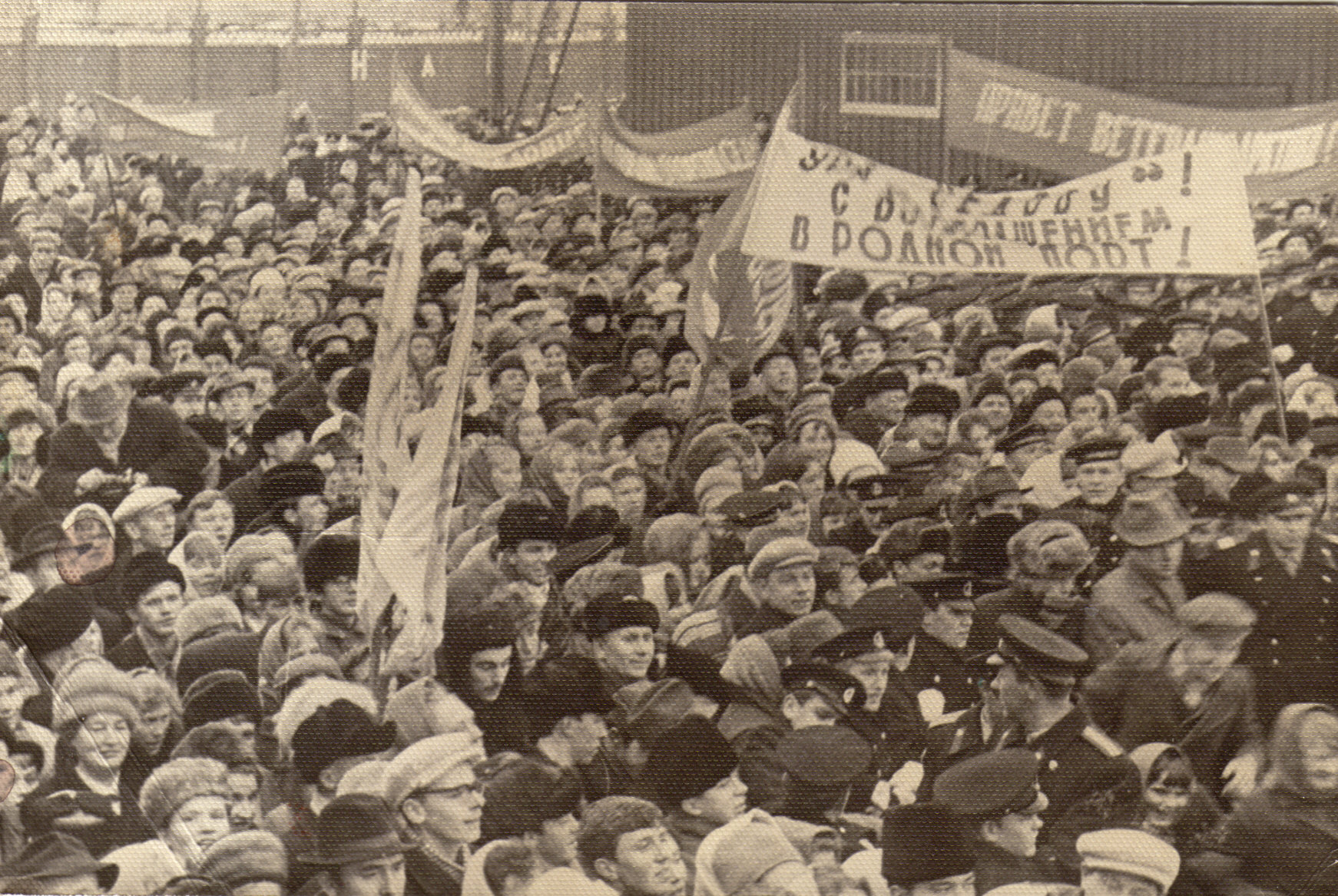 Об этом флаге любопытную историю услышал я от Р.Самойловича. Когда он уезжал из Ленинграда, к нему подошла не перроне незнакомая женщина и попросила взять небольшой пакет, но вскрыть его на судне. В пакете оказалось знамя с любовно вышитой надписью.