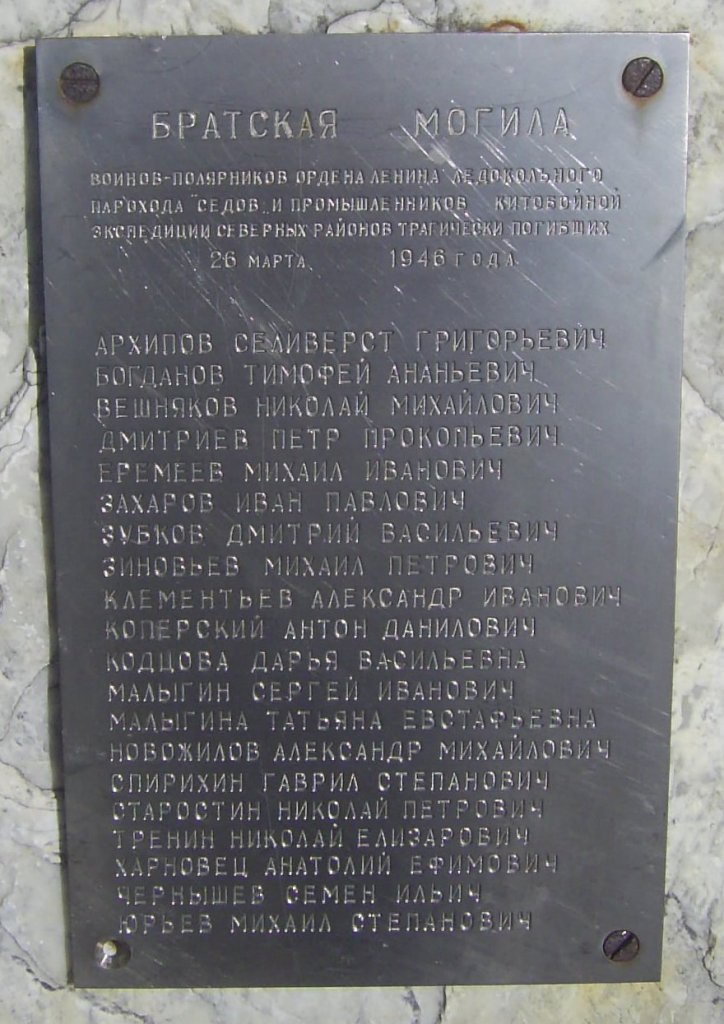 Памятный знак на братской могиле промысловиков-зверобоев, трагически погибших при пожаре на ледокольном пароходе «Георгий Седов» в Молотовском порту 26 марта 1946 года. Открыт в 1975 году, автор – Е.П. Назаров.