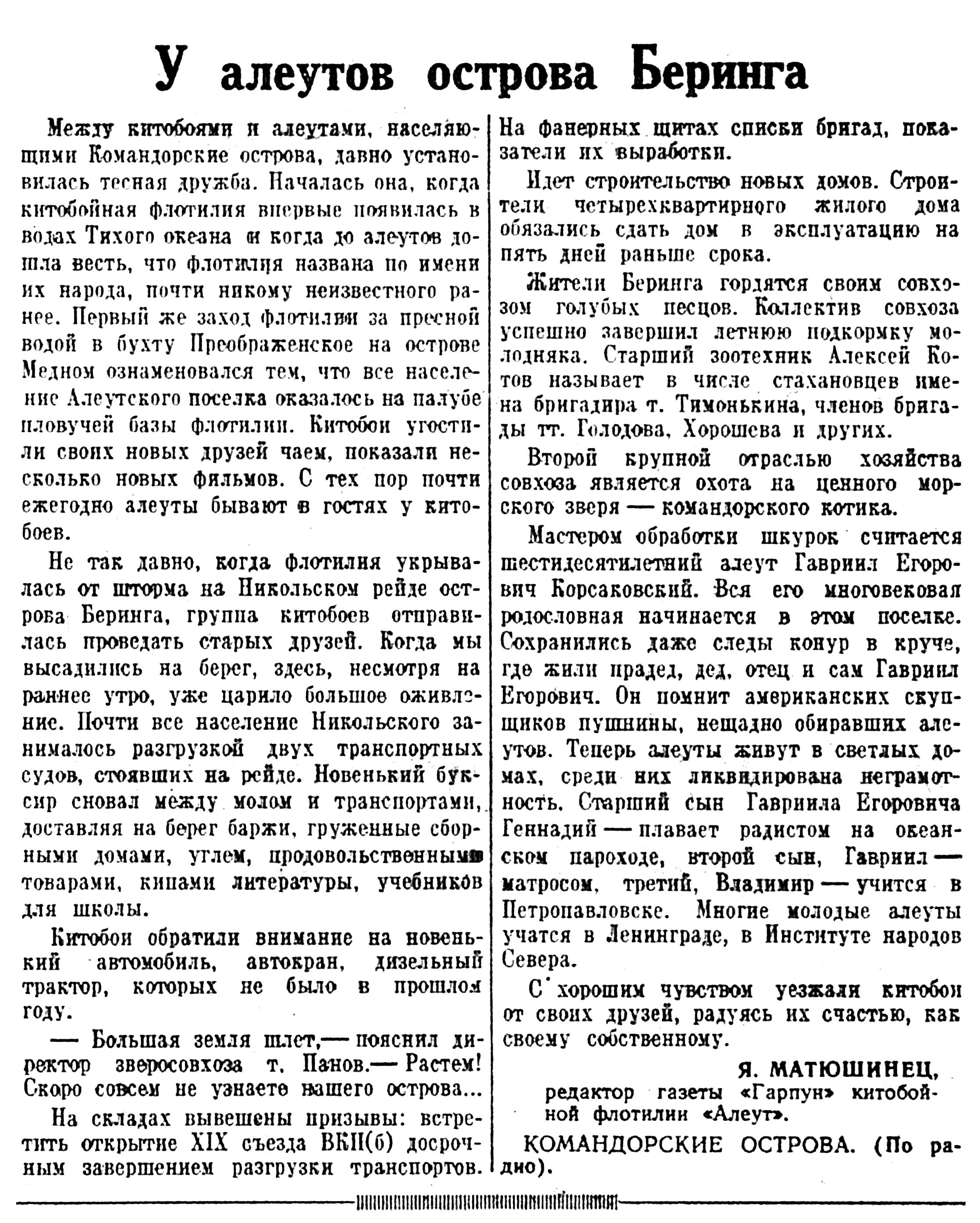 Мастером обработки шкурок считается шестидесятилетий алеут Гавриил Егорович Корсаковский. Вся его многовековая родословная начинается в этом поселке. Сохранились даже следы конур в круче, где жили прадед, дед, отец и сам Гавриил Егорович. Он помнит американских скупщиков пушнины, нещадно обиравших алеутов. Теперь алеуты живут в светлых домах, среди них ликвидирована неграмотность. Старший сын Гавриила Егоровича Геннадий — плавает радистом на океанском пароходе, второй сын, Гавриил — матросом, третий, Владимир — учится в Петропавловске. Многие молодые алеуты учатся в Ленинграде, в Институте народов Севера.