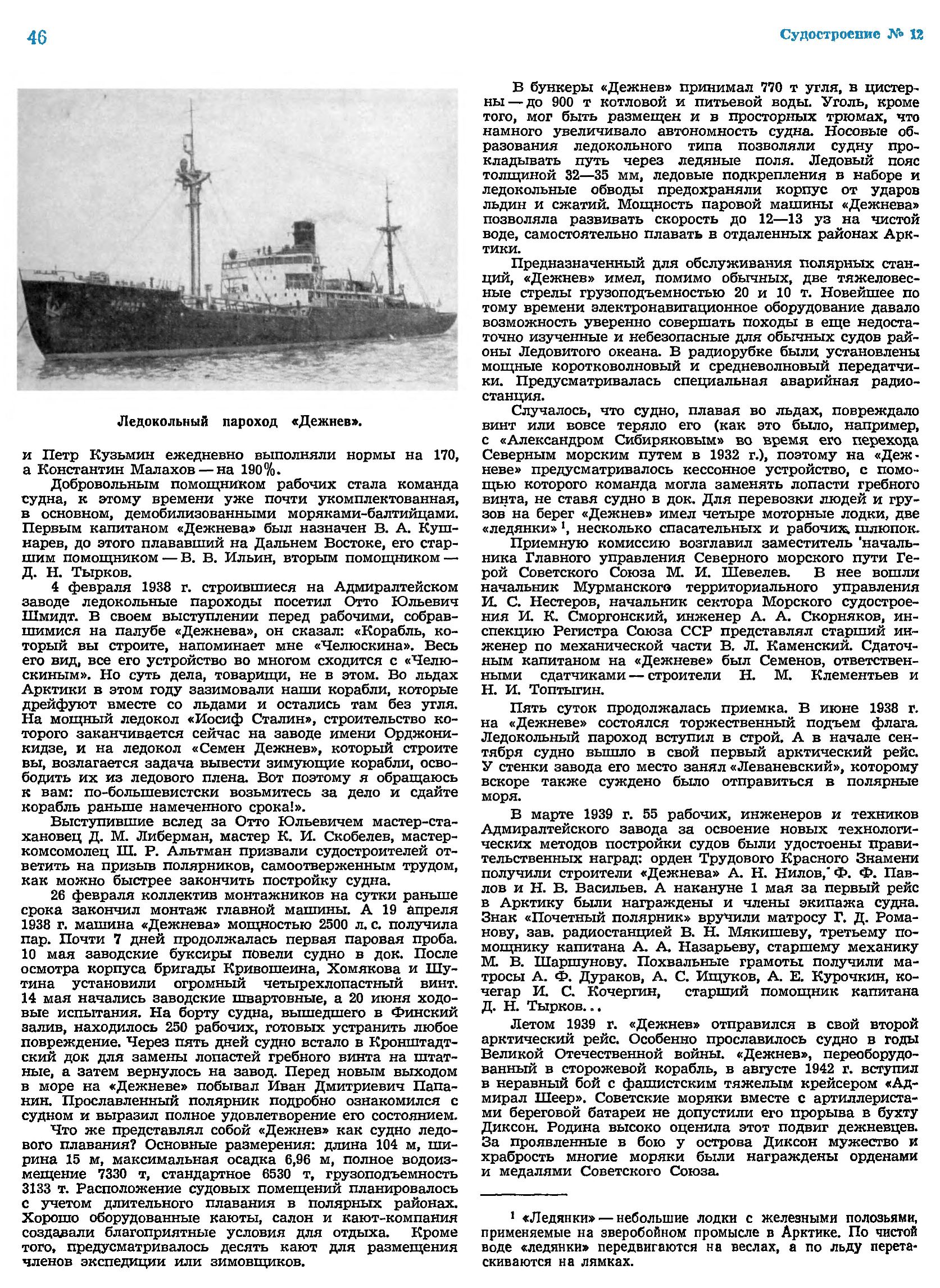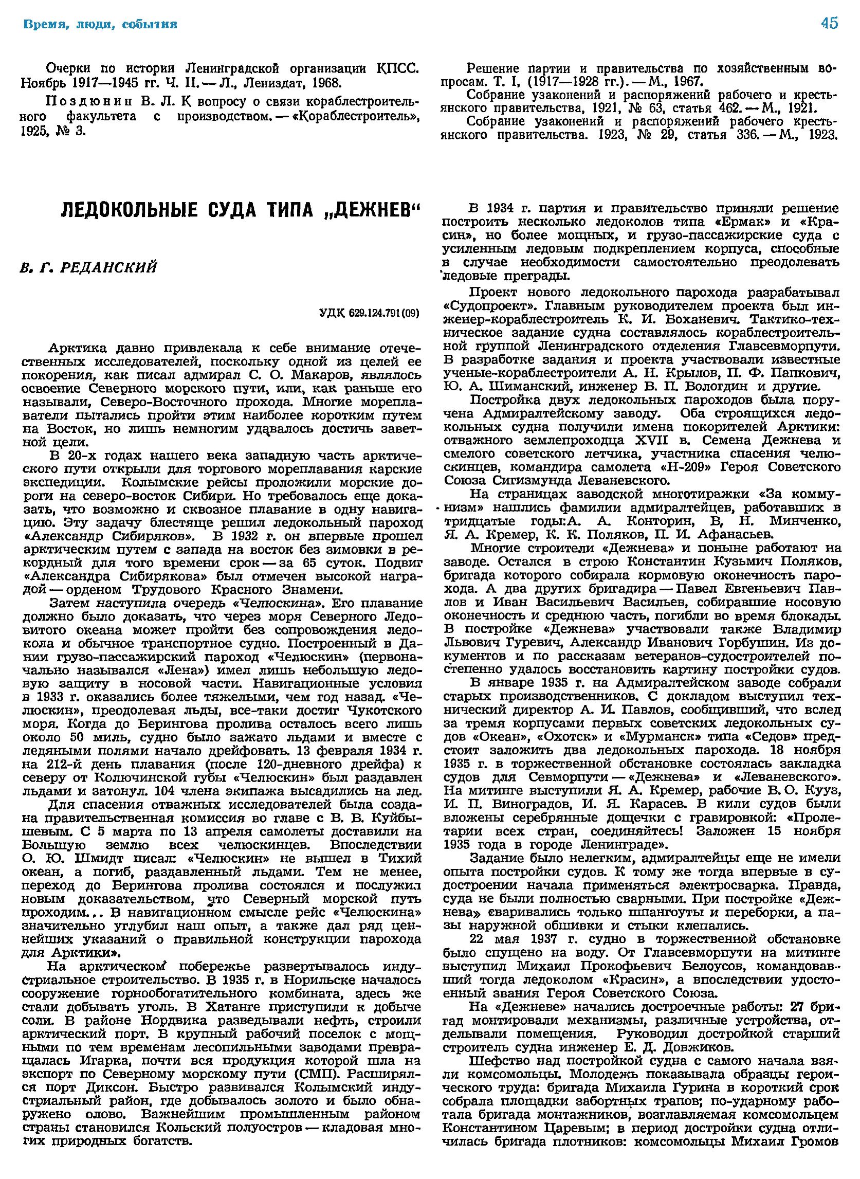 В. Г. Реданский. Ледокольные суда типа «Дежнев»// Судостроение №12 1971 с.45-46