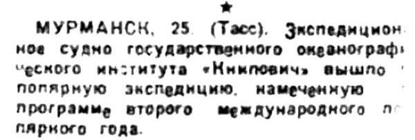 ♦ МУРМАНСК, 25 (Тасс). Экспедиционное судно государственного океанографического института "Книпович" вышло в полярную экспедицию, намеченную по программе второго международного полярного года.