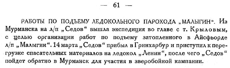 РАБОТЫ ПО ПОДЪЕМУ ЛЕДОКОЛЬНОГО ПАРОХОДА „МАЛЫГИН". Из Мурманска на л/п „Седов" вышла экспедиция во главе с т. Крыловым, с целью организации работ по подъему затопленного в Айсфьорде л/п „Малыгин". 14 марта „Седов" прибыл в Гринхарбур и приступил к перегрузке спасательных материалов на ледокол „Ленин", после чего „Седов" пойдет обратно в Мурманск для участия в зверобойной кампании.