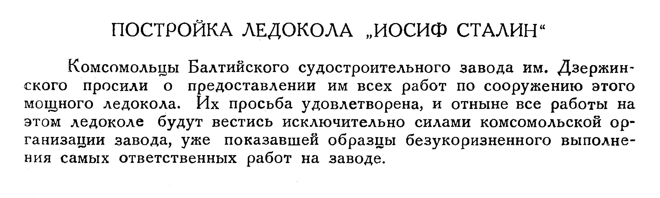 Комсомольцы Балтийского судостроительного завода им. Дзержин­ского просили о предоставлении им всех работ по сооружению этого мощного ледокола. Их просьба удовлетворена, и отныне все работы на этом ледоколе будут вестись исключительно силами комсомольской ор­ганизации завода, уже показавшей образцы безукоризненного выполне­ния самых ответственных работ на заводе.