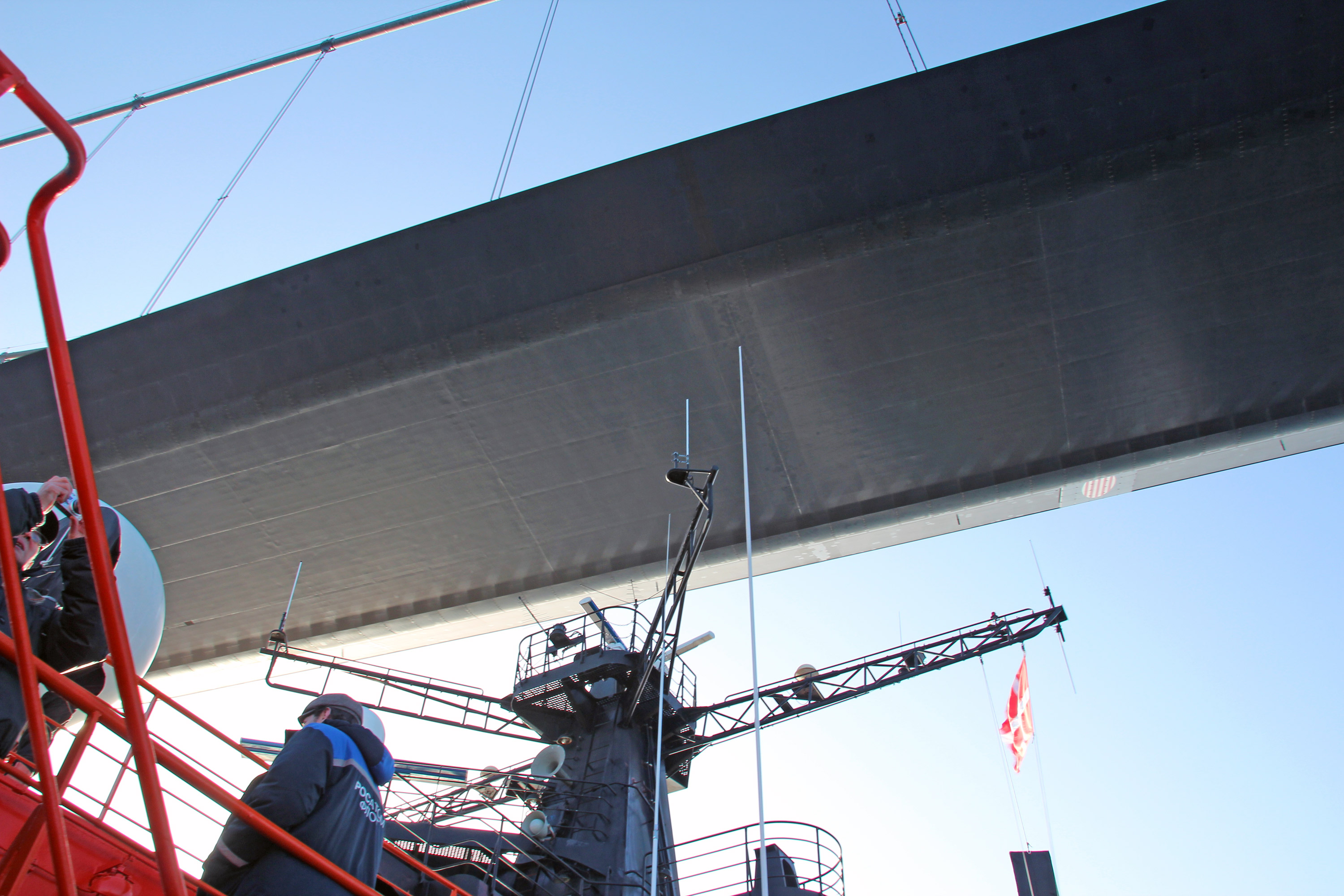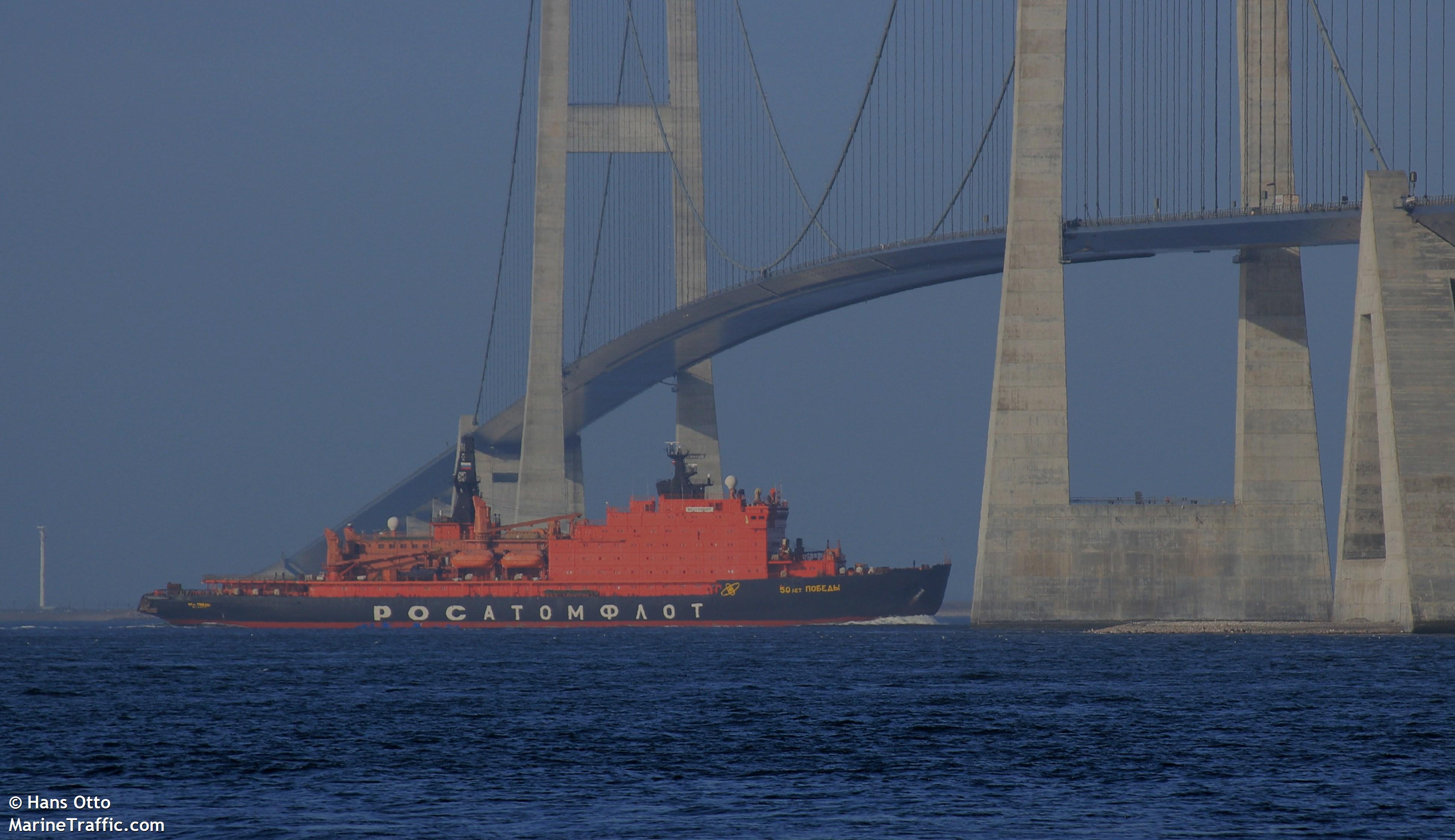 Проход атомного ледокола "50 лет Победы" в проливе Большой Бельт под одноименным мостом 11.03.2012.
