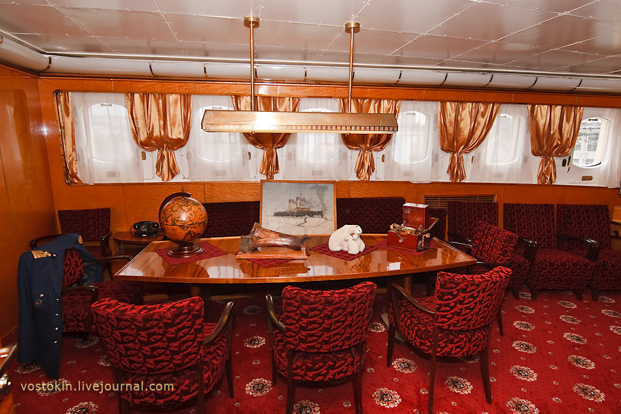 :": 53 Рабочий кабинет капитана. Сюда входить не разрешили, потому как капитан на ледоколе есть, и это его рабочий кабинет, и негоже сюда толпы водить. Хотя один из моих коллег все же ввалился в каюту под номером 2 с табличкой "капитан". Нужно отметить, что несмотря на продолжительное время эксплуатации ледокола, капитанов было всего три: П. А. Пономарев, с 1961 Б.М. Соколов, и Александр Баринов, являющийся капитаном в настоящее время.