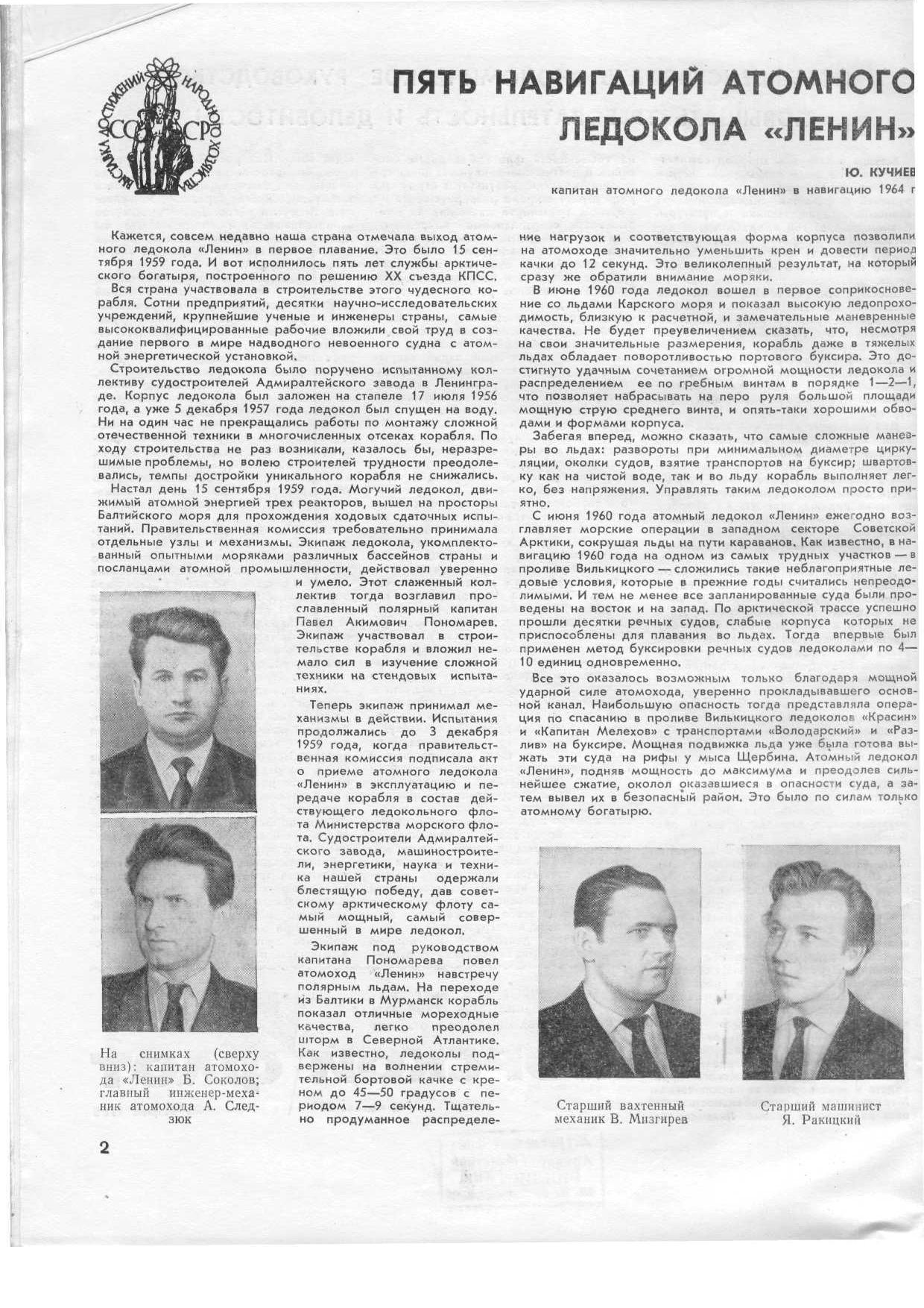 12 сентября 1959 года «Ленин» вышел на ходовые испытания. Повел его капитан Павел Акимович Пономарев, между прочим уроженец Сумского Посада – помор. Помню цветную обложку первого номера «Огонька» за 1960 год (не было в стране более популярного журнала) – девочка мелом рисует на школьной доске ледокол «Ленин» и рядом знакомое – «Миру - мир!».