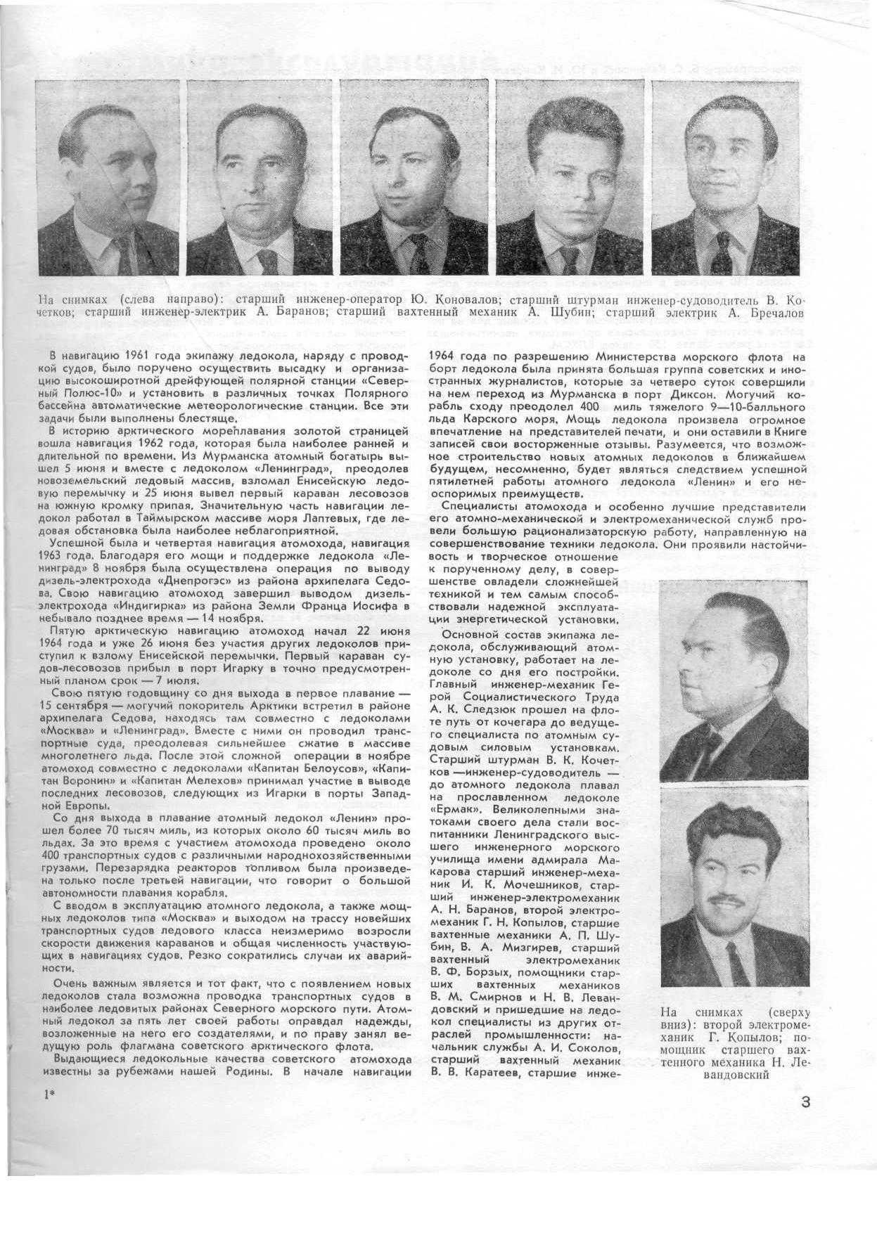 Еще о капитанах а/л "Ленин. Так, в навигацию 1961 года капитаном-наставником на атомоходе ходил Георгий Осипович Кононович. В середине семидесятых годов капитаном был Владимир Константинович Кочетков, с 1982г. - Зигфрид Адольфович Вибах, а также Валерий Иванович Шестопалов и Андрей Алексеевич Смирнов (1989г.).