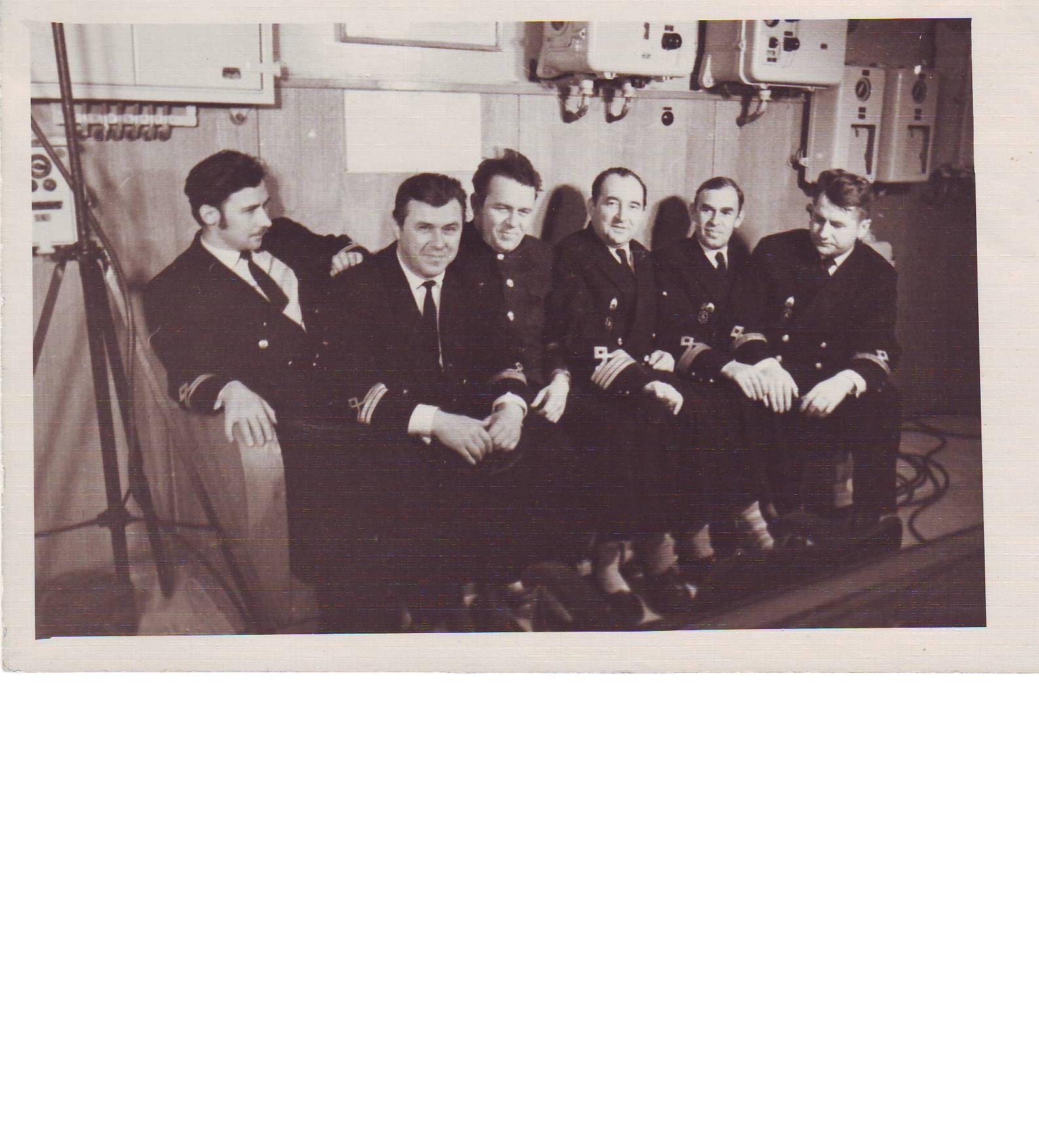 "Навигация "Арктика-63". Капитан Соколов Борис Макарович, дублер капитана Вавилов Е.А., ст. штурман Кочетков В.К., 2 штурман Чупыра А.Л., 3 штурман Бабинцев В.И., 4 штурман Филатов Э.А. (справа налево) : Капитан1.jpg
