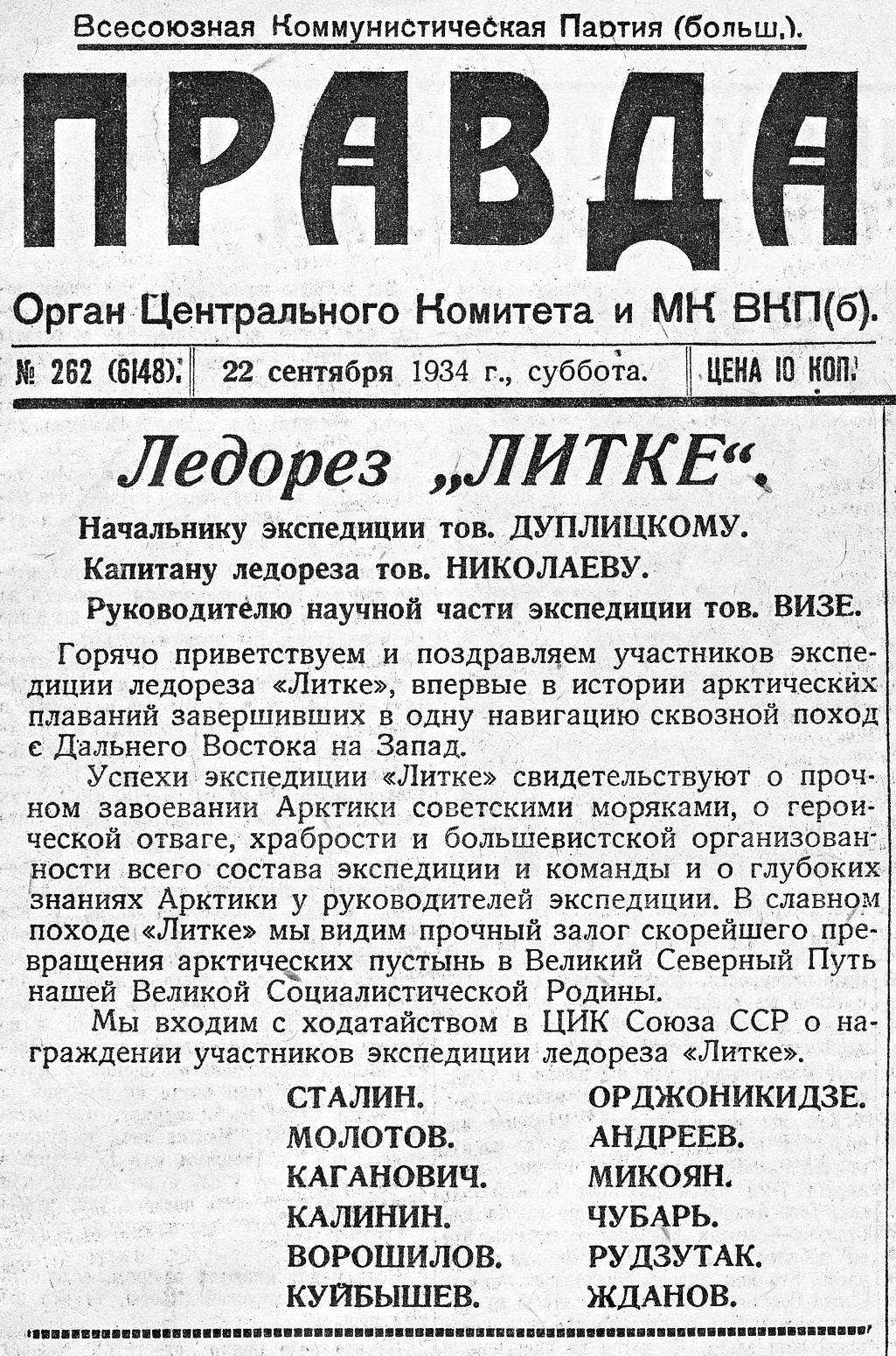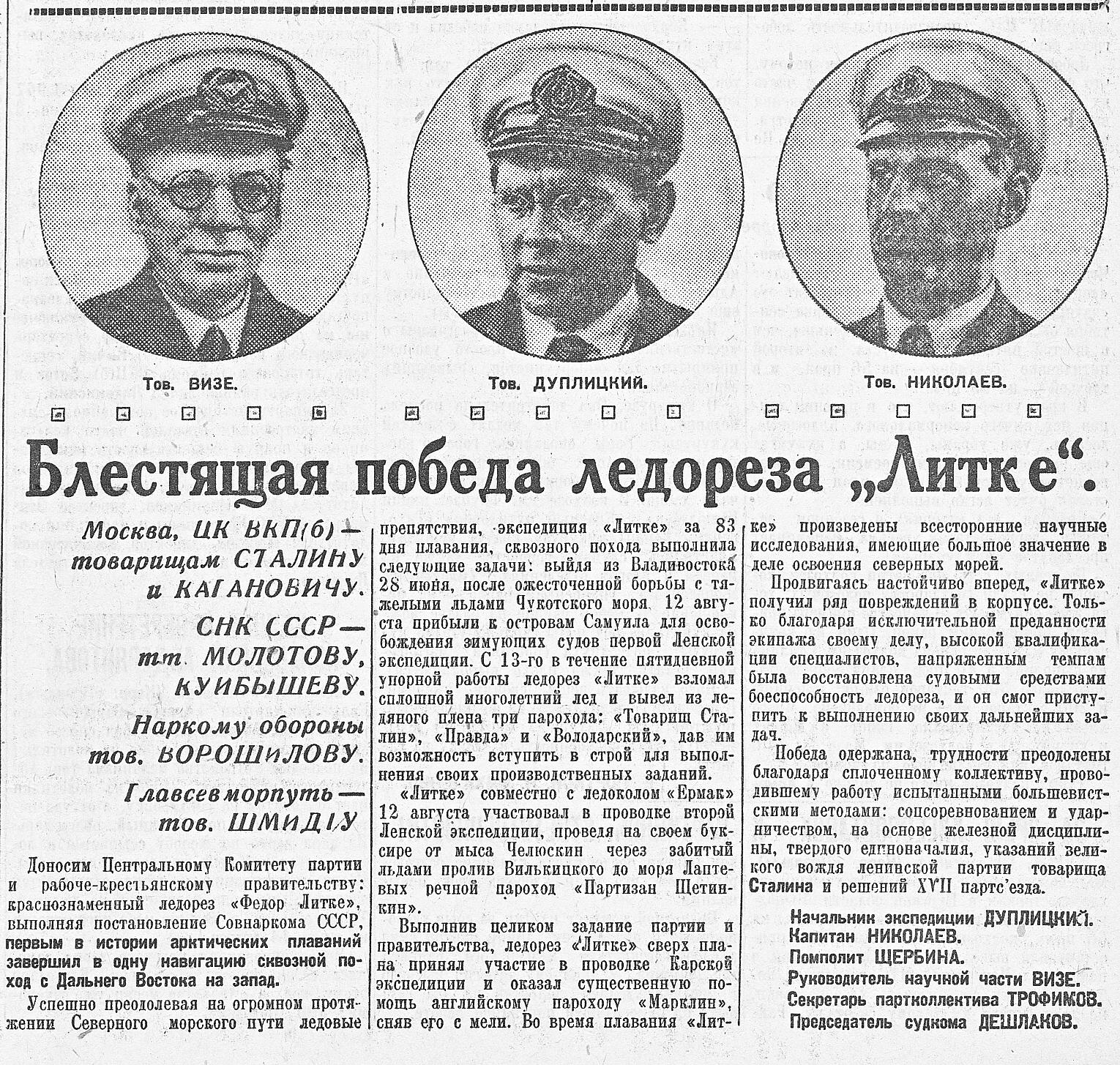 Доносим Центральному Комитету партии и рабоче-крестьянскому правительству: краснознамённый ледорез «Фёдор Литке», выполняя постановление Совнаркома СССР, первым в истории арктических плаваний завершил в одну навигацию сквозной поход с Дальнего Востока на запад.