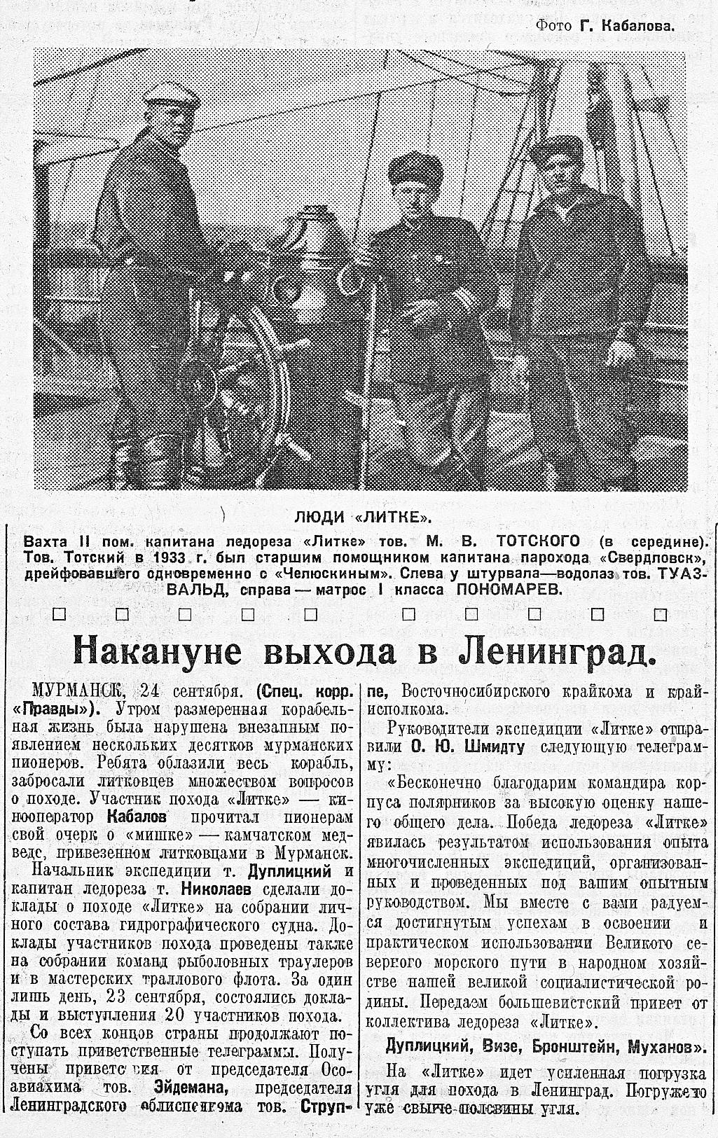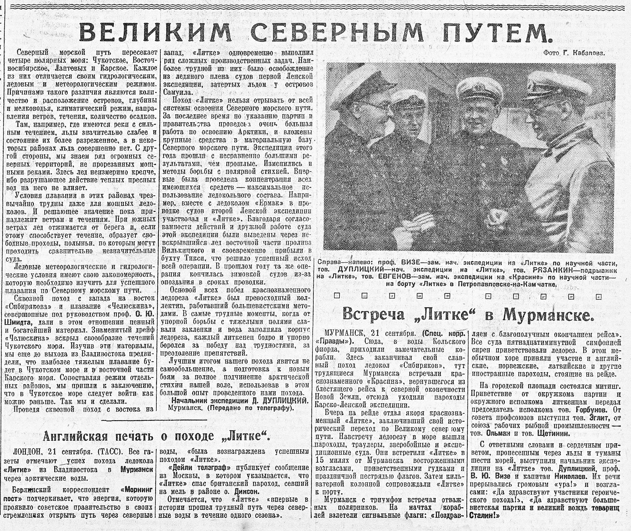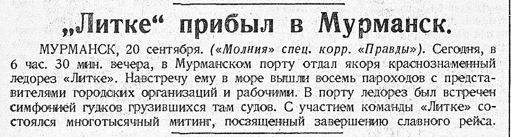 МУРМАНСК, 20 сентября. («Молния» спец. корр. «Правды»). Сегодня, в 6 час. 30 мин. вечера, в Мурманском порту отдал якоря краснознамённый ледорез «Литке». Навстречу ему в море вышли восемь пароходов с представителями городских организаций и рабочими. В Порту ледорез был встречен симфонией гудков грузившихся там судов. С участием команды «Литке» состоялся многочисленный митинг, посвящённый завершению славного рейса.