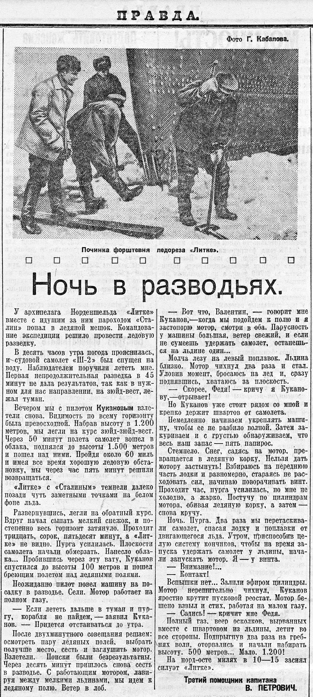 ЛЕДОРЕЗ «ЛИТКЕ», 20 сентября. (Радио спец. корр. «Правды»). Поход «Литке» открыл перед глазами его участников картину огромной работы, проделанной по освоению Севера. С каждой милей пути перед нами развёртывался большой производственный фильм на фоне колоритных красок Севера.