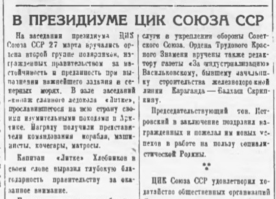 Вчера в Кремле на заседании президиума ЦИК СССР состоялось вручение орденов членам экспедиции и команды краснознамённого ледореза «Литке», совершившего сквозной поход через Северный ледовитый океан с Дальнего Востока на Запад.