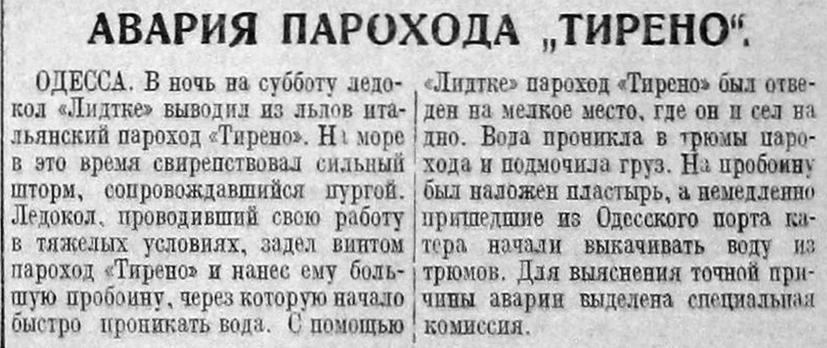 ОДЕССА. В ночь на субботу ледокол «Лидтке» выводил из льдов итальянский пароход «Тирено». На море в это время свирепствовал сильный шторм, сопровождавшийся пургой. Ледокол, проводивший свою работу в тяжелых условиях, задел винтом пароход «Тирено» и нанес ему большую пробоину, через которую начало быстро проникать вода. С помощью
