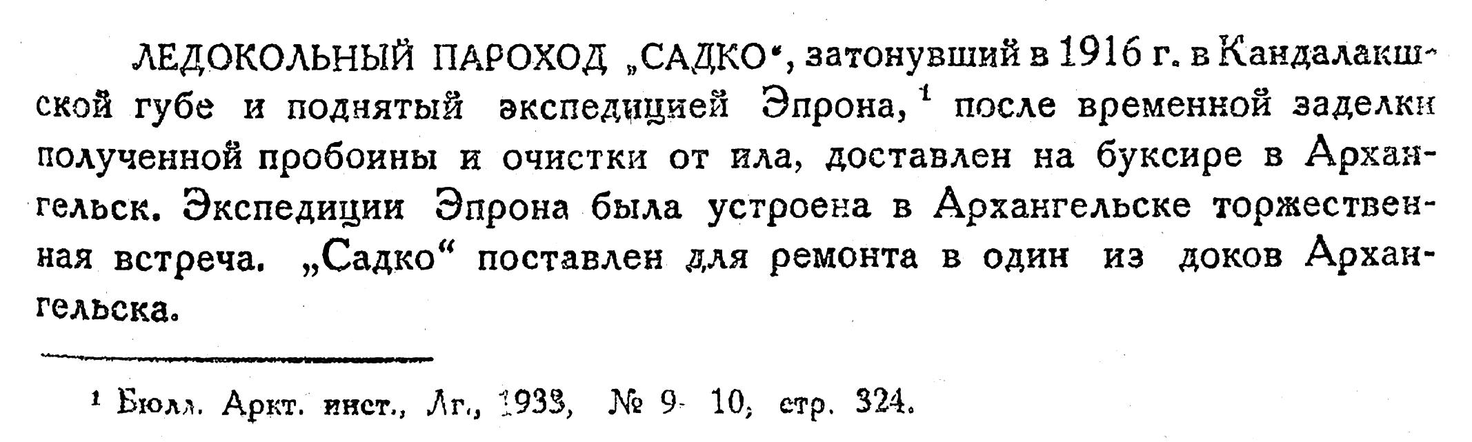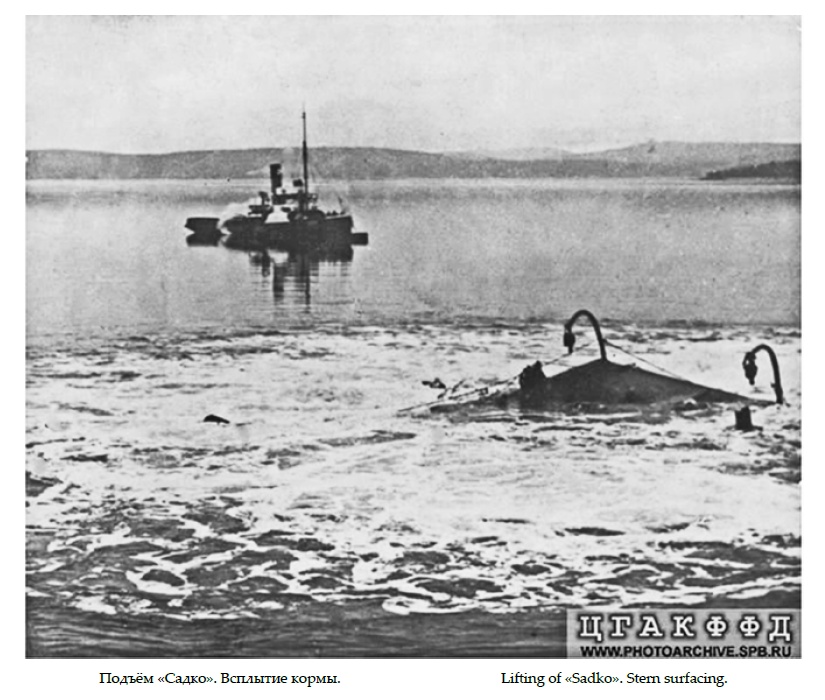 Конец операции совпал с началом полярной ночи. Работая большевистскими темпами, мы сегодня добились победы и чести рапортовать партии и правительству следующее. Вчера, 14 октября, в 15 час. 28 мин. дня всплыла корма «Садко», и сегодня в 10 час. 30 мин. утра со дна залива поднялся весь корабль. Через четверть часа на «Садко» поднят морской флаг пролетарского государства... Подъёмом «Садко» ЭПРОН заканчивает сезон, в течение которого добился следующих успехов: у берегов Шпицбергена поднят «Малыгин», в Финском заливе с рекордной глубины совместно с РККФ поднята подводная лодка № 9, в Ладожском озере поднят озёрный теплоход «Крестинтерн», в Чёрном море спасен «Харьков» и поднят пароход «Потёмкин», у берегов Норвегии спасён пароход «Кола», в Белом море спасён терпевший бедствие, считавшийся безнадёжным, иностранный пароход «Алкаид», в Каспийском море поднят пароход «Стенька Разин». Сегодня, в 2 часа дня, «Садко» на буксире пароходов «Совнарком» и «Ленин» отведен к о. Богомолиха, где в кратчайший срок будет заделана пробоина, и пароход последует в Архангельск. После ремонта «Садко» поступит в распоряжение Главного управления Севморпути для новых славных побед во льдах Арктики. Да здравствует наш вождь – Централь-ный Комитет партии во главе с тов. Сталиным! Да здравствует правительство Советского Союза! Нач. ЭПРОН Крылов. Нач. Северного округа Васин. Производители работ: Симонов, Лавров, Памаин».