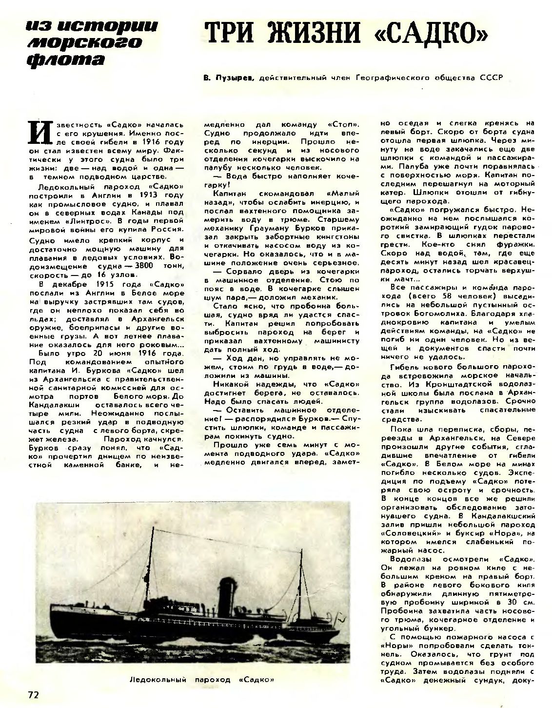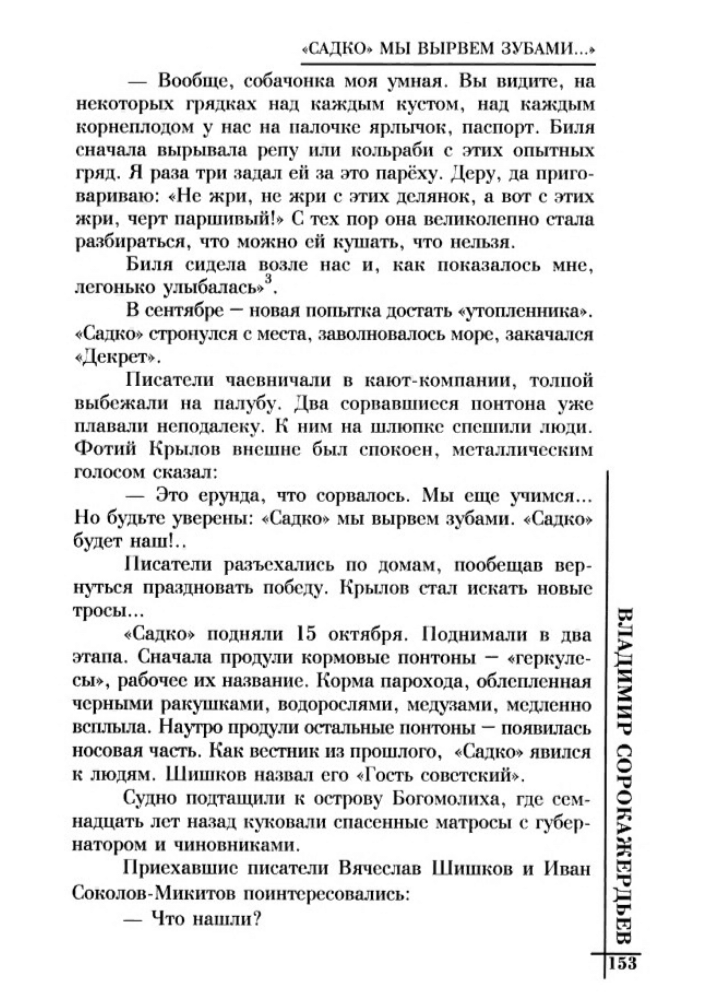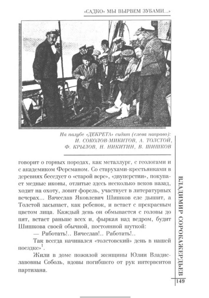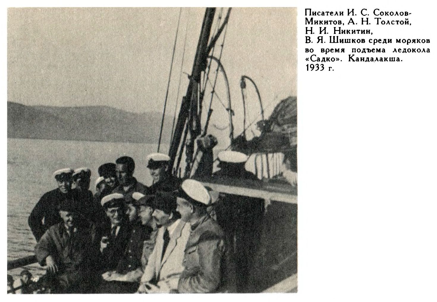 Мы едем вместе на подъём «Садко». Он, Шишков и я. Но ему мало было только этого подъёма. Он изменил весь маршрут, нарушил все планы начальника ЭПРОНа Ф.И. Крылова. Бело-морканал, пристани, шлюзы, капитаны, чекисты, заключённые, консервные фабрики Кандалакши, океанографические станции, совхоз «Имандра», опытные полярные поля, Хибины, апатиты, гор-норабочие, инженеры, старообрядческие деревни на Выге – всё необходимо ему, кроме водолазов и кроме подъёма парохода, затонувшего ещё в годы первой империалистической войны.