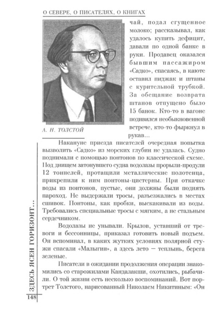 Что трогает во всей этой истории? Многое. И то, что около 100 лет назад наши водолазы опуска-лись на глубины более 100 метров. И то, что мы спасали чужие корабли и подводные лодки, а не они – наши. И то, что наши выдающиеся писатели искренне интересовались освоением Крайнего Севера. И то, что А. Толстой вынашивал главы «Петра Первого» здесь, на кольской земле. И то, что наши предки всем этим гордились… Кажется, с литературным жанром социалистического реализма ушло что-то неизмеримо более важное.
