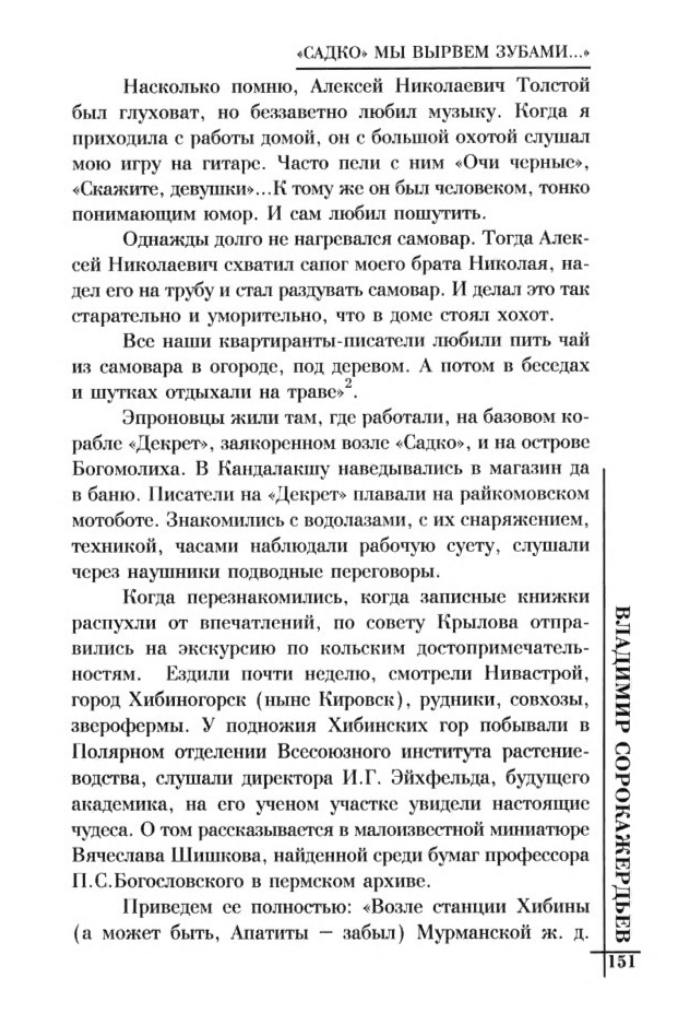 А вот фрагмент из воспоминания Н.Н. Никитина «А.Н. Толстой» (1957), в котором есть и строки о пребывании в Хибинах. «...В Толстом было много творческой энергии. Вспоминаю одну нашу поездку, после которой он собирался «отразить» жизнь водолазов. В этой же поездке он заинтере-совался множеством превосходных вещей. И, что самое главное, именно в эти дни в нём, в его писательском арсенале, зародилось многое, касавшее-ся русского Севера, что и вошло впоследствии в роман о Петре, – люди, ощущения, пейзажи. Как же это было?