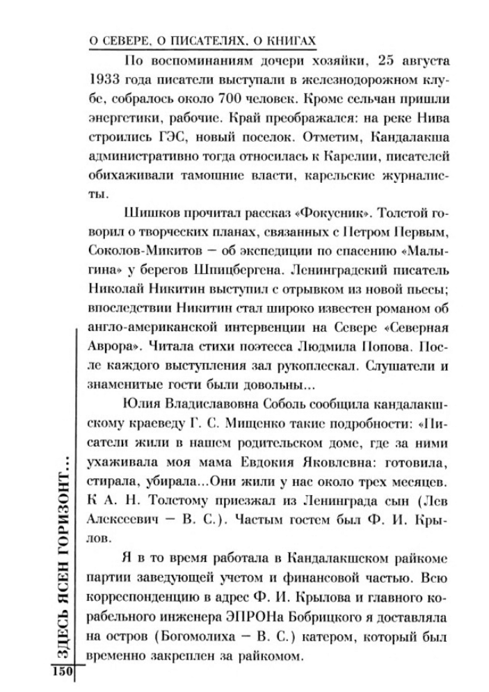 Что же происходило в Кандалакшском заливе с 18 сентября по 14 октября, в ожидании какого события А.Н. Толстой, В.Я. Шишков и Н.Н. Никитин посетили Хибины? Об этом – очерк А.Н. Толстого «Смелость, творчество, упорство» [Новый материк. М.: Сов. Россия, 1982. С. 43-47].