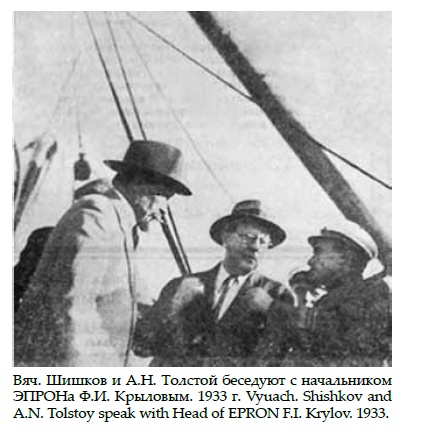 В тот же день из Москвы пришла ответная депеша. «Кандалакша. Нач. ЭПРОНа Крылову. Поздравляем героических работников советской подводной техники, краснознамённых эпро-новцев с новым блестящим трудовым успехом – подъёмом с морского дна ледокола «Садко». Эта ваша победа, одержанная в тяжёлых условиях хо-лодного Севера, является выдающимся образцом большевистской работы. Сталин, Молотов, Кага-нович, Ворошилов. Янсон». А в популярном тог-да журнале «Карело-Мурманский край» [1933. № 7-8, с. 71] появилась информация: «Героическая работа ЭПРОНа по подъему «Садко» протекала в обстановке самого пристального внимания широ-ких кругов пролетарской общественности. Место работ посетил ряд советских писателей, которые отобразят в своих произведениях этапы борьбы и побед Краснознамённого ЭПРОНа за полярным кругом. На снимке – писатели Вяч. Шишков и А.Н. Толстой беседуют с Ф.И. Крыловым».