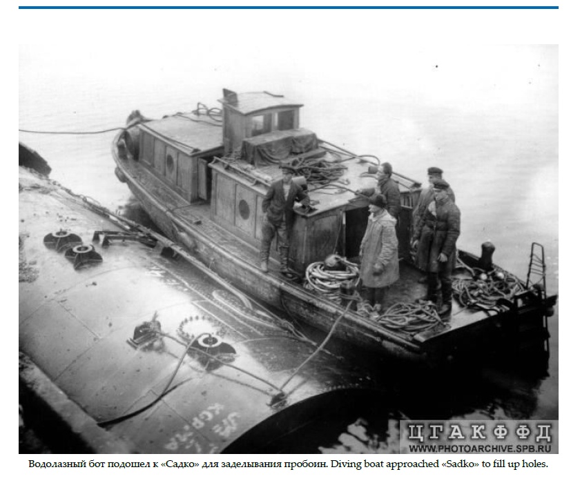 Каких бы это сил и лишений не потребовало - «Садко» должен быть поднят. Большевики не от- ступают. Была уже глубокая осень. Близились туманы и снежные бури. Буксирный пароход «Совнарком», помогавший своими мощными помпами, ушёл в Архангельск. В пустынном, студенеющем заливе остался один «Декрет» с проржавленными бортами, на машины его нечего было рассчитывать, и водолазы, обследовав грунт, где в новом положении лежал «Садко», начали вручную – кирками и крючками – пробивать под его днищем каналы для завода стальных полотенец.