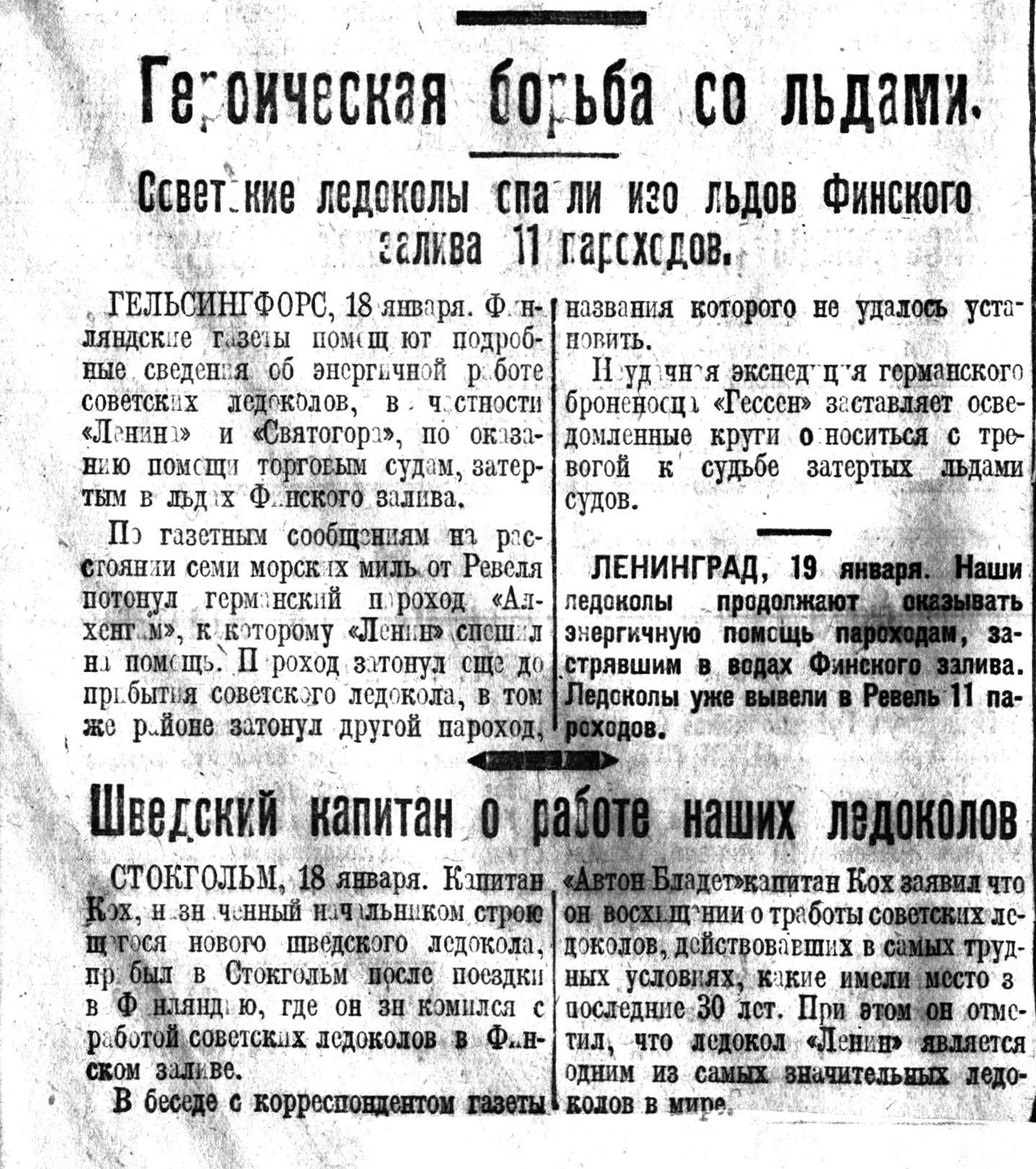 ГЕЛЬСИНГФОРС, 18 января. Финляндские газеты помещают подробные сведения об энергичной работе советских ледоколов, в частности «Ленина» и «Святогора», по оказанию помощи торговым судам, затертым в льдах Финского залива.