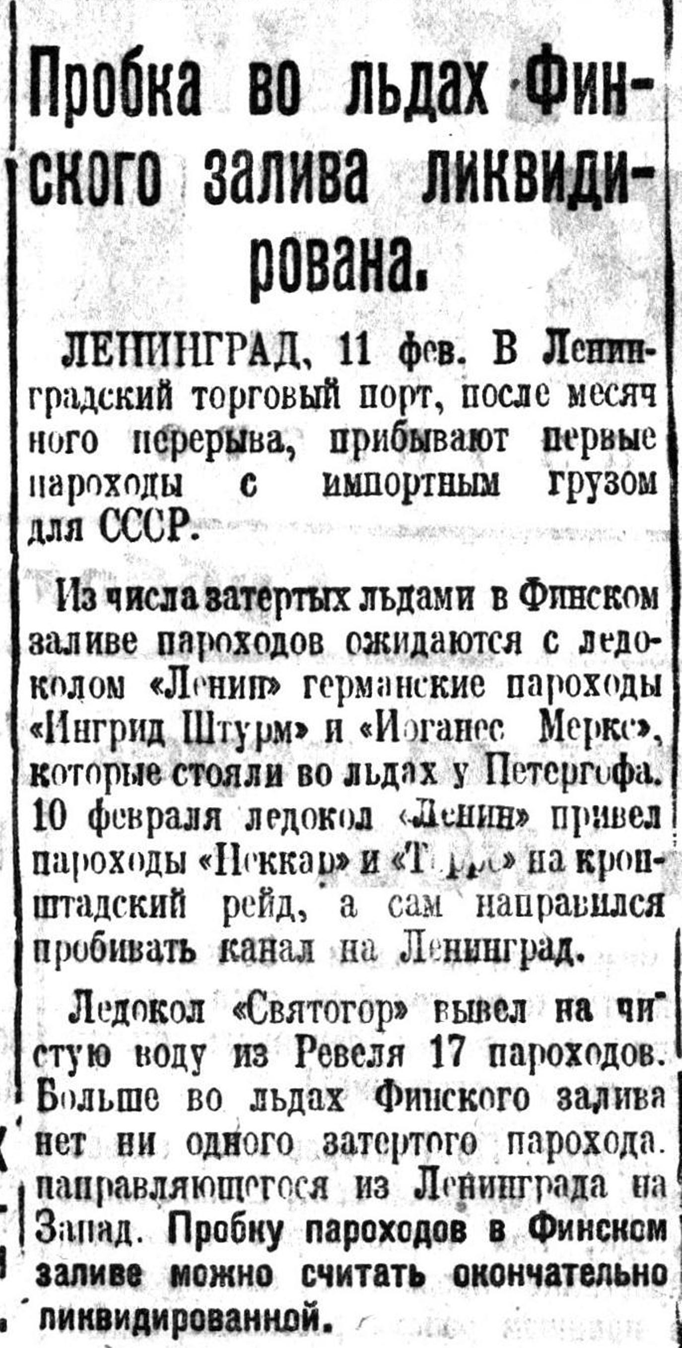 Из числа затертых льдами в Финском заливе пароходов ожидаются с ледоколом «Ленин» германские пароходы «Ингрид Штурм» и «Иоганес Меркс», которые стояли во льдах у Петергофа. 10 февраля ледокол «Ленин» привел пароходы «Неккар» и «Терре» на кронштадтский рейд, а сам направился пробивать канал на Ленинград.