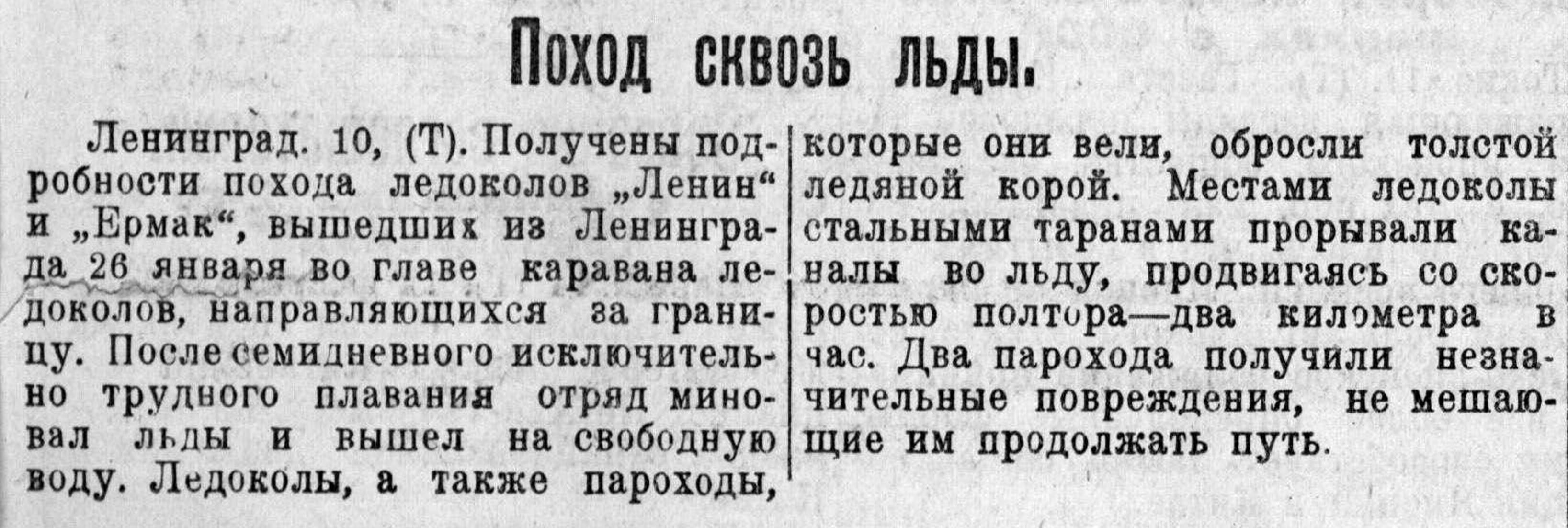 Ленинград. 10, (Т). Получены подробности похода ледоколов „Ленин" и „Ермак“, вышедших из Ленинграда 26 января во главе каравана ледоколов, направляющихся за границу. После семидневного исключительно трудного плавания отряд миновал льды и вышел на свободную воду. Ледоколы, а также пароходы, которые они вели, обросли толстой ледяной корой. Местами ледоколы стальными таранами прорывали каналы во льду, продвигаясь со скоростью полтора—два километра в час. Два парохода получили незначительные повреждения, не мешающие им продолжать путь.