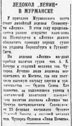ЛЕНИНГРАД, 2 апреля. Приехавший из Швеции командир ледоколов «Красин» и «Ленин» тов. Эгги сделал доклад управлению порта о работе, проделанной «Лениным» за границей. Всего выведено изо льдов 156 пароходов, главным образом шведских и датских. Кроме того, значительное число пароходов прошло собственными силами по каналу, пробитому «Лениным». Работа «Ленина» проходила в чрезвычайно тяжелых условиях, в узких местах, среди мелей и «банок». Команда «Ленина» работала самоотверженно круглые сутки. Получена благодарность шведского и датского правительств.