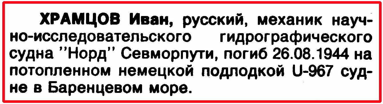 О гибели экипажа судна «Норд» известно, к сожалению, очень мало. В навигацию 1944 г. оно было передано в распоряжение Беломорской военной флотилии. Как видно из отчета штаба морских операций за навигацию 1944 г. в западном районе Арктики (ГА Арх. обл., ф. 2323, оп. 10, д. 72, глава IV. Операции гидрографических судов ГУСМП; ЦА ММФ, ГУСМП, оп. 2505, св. 35, д. 399, л. 22. Докладная записка СНК СССР заместителя начальника ГУСМП Каминова об обстоятельствах нападения на г/с «Норд» и меры, принятые по розыску судна (31 августа 1944 г.).), это судно 26 июля вышло из Архангельска и 8 августа прибыло на Диксон. 11 августа оно было направлено к полуострову Михайлова для высадки береговой гидрографической экспедиции, 20-го, выполнив задание, возвратилось на Диксон. В новый и последний свой поход «Норд» направился 23 августа, имея указание зажечь огни на острове Вардропер, мысе Стерлегова и в проливе Норденшельда. 25 числа судно побывало «а полярной станции мыса Стерлегова. Здесь моряки приняли на борт несколько человек, доставив туда новых зимовщиков. В 11 ч 45 мин судно направилось от полярной станции к островам Рингнес, Кравкова и Белуха, где надлежало зажечь светящие огни. А в 7 ч 10 мин 26 августа начальник полярной станции мыса Стерлегова донес на Диксон, что в 5 ч 15 мин на волне 600 м открытым текстом, в течение 6—7 мин непрерывно передавалась следующая радиограмма: «Всем, всем, я «Норд» обстрелян подводной лодкой». Позднее никаких дополнительных сведений о «Норде» не поступало. Капитану судна Павлову было дано по радио указание в случае, если все в порядке, 26 августа в 23 ч 00 мин на волне 600 м дать пять точек. Однако в условленный час Диксонский радиоцентр сигнала «Норда» не слышал, хотя радиостанция мыса Челюскин в 22 ч 59 м на волне 600 м приняла пять точек. Было ли это случайное совпадение или эти точки передали с немецкой подводной лодки, оказать трудно.