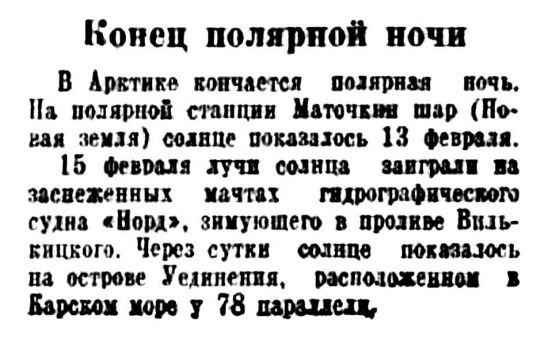 15 февраля лучи солнца заиграла на заснеженных мачтах гидрографического судна «Норд», зимующего в проливе Вилькицкого. Через сутки солнце показалось на острове Уединения, расположенном в Карском море у 78 параллели.