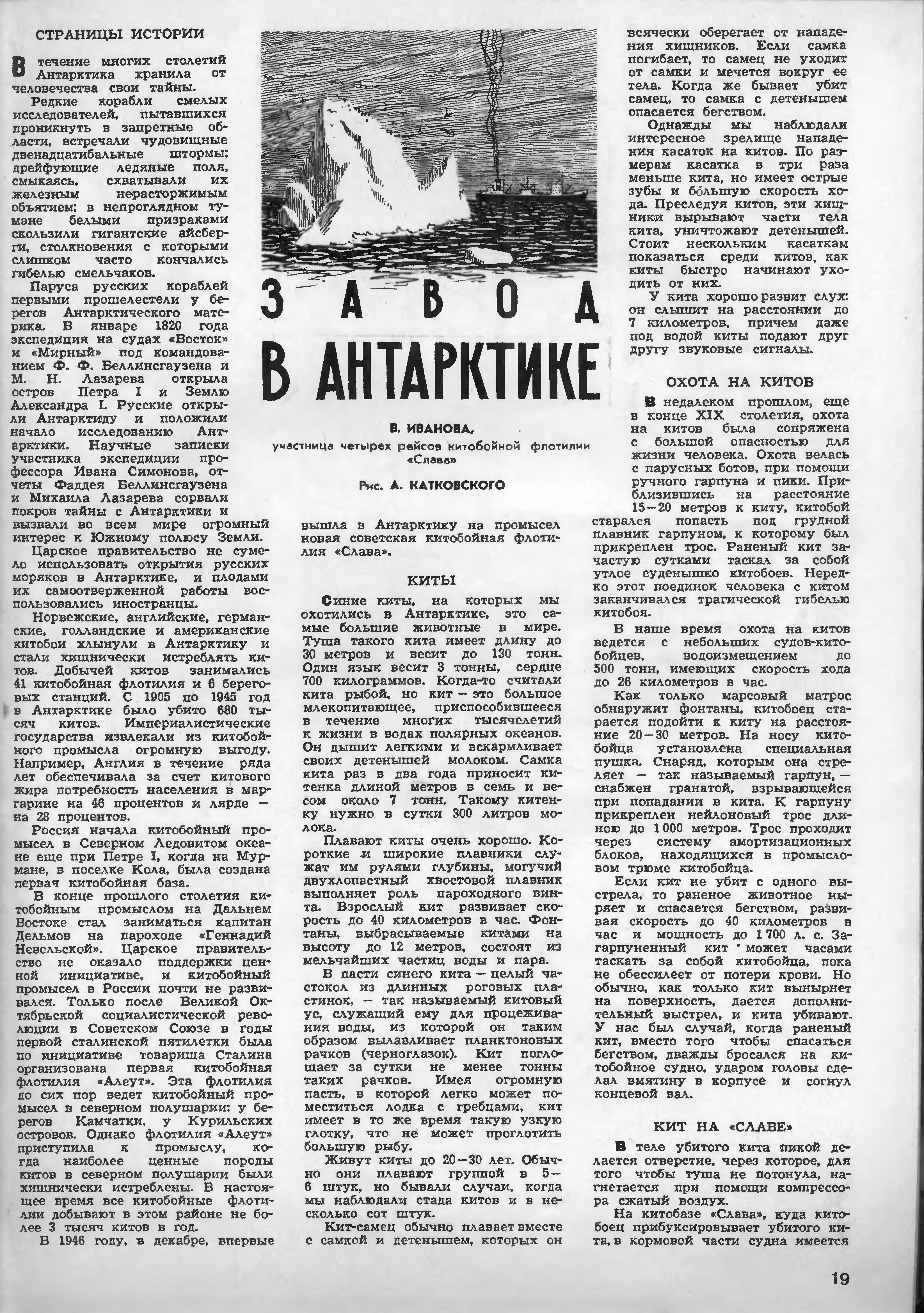 "В зиму 1946 и 1947 годов впервые в истории русского рыболовного флота суда советской китобойной экспедиции бороздили воды Антарктики, добывая китов. Экспедиция имела огромное значение: она доказала всему миру силу и мощь советского рыболовного флота, она изучила условия добычи китов в Антарктике, и, главное, она привлекла неиссякаемые богатства морей, омывающих Южный полюс, к использованию в плановом социалистическом хозяйстве нашей страны. Недавно возвратилась из дальнего плавания вторая экспедиция, осенью этого года уйдет третья. Китобойный промысел в Антарктике стал частью плана лова рыбы советского рыболовного флота.