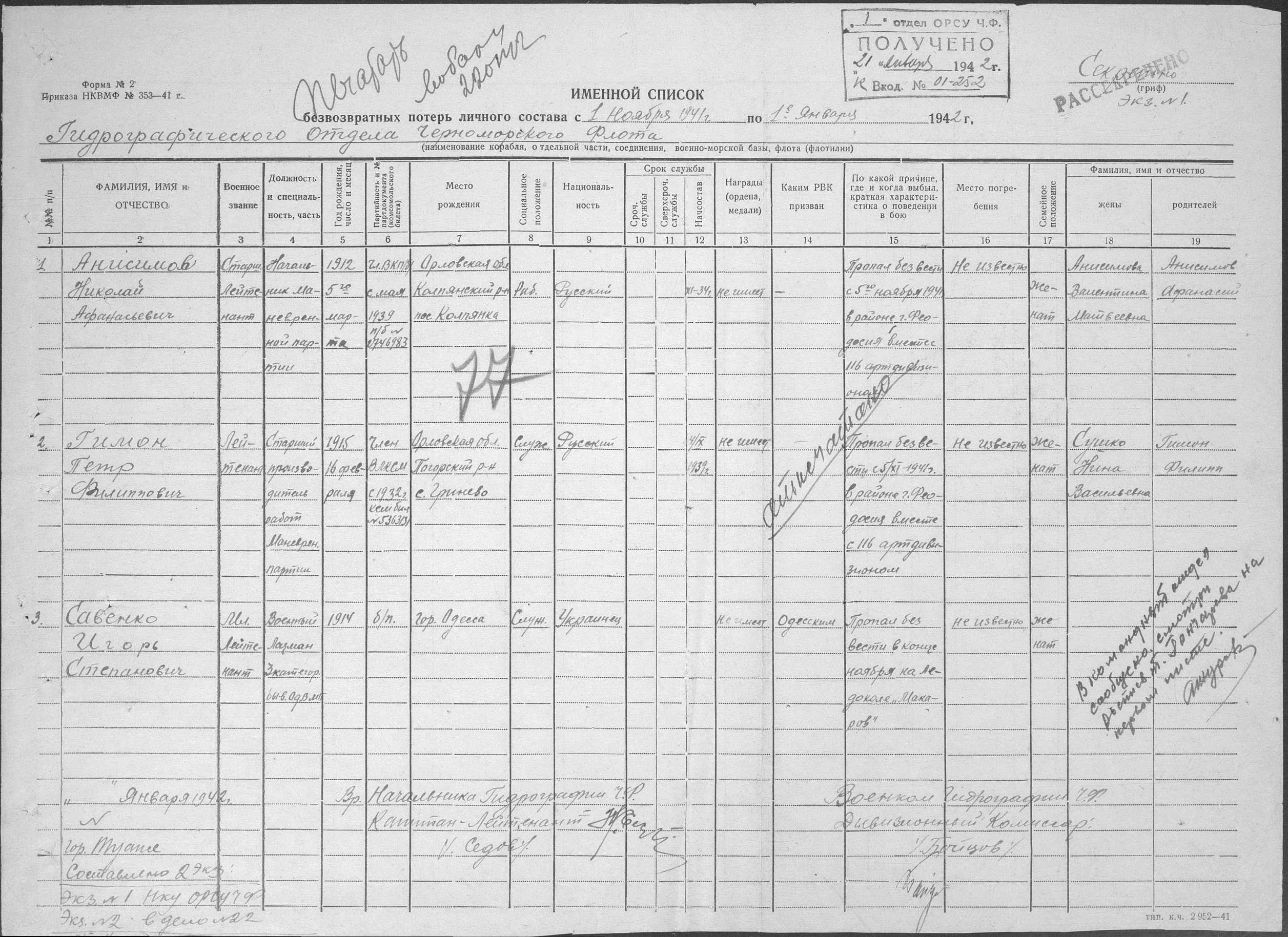 Именной список безвозвратных потерь личного состава с 1ноября 1941 г. по 1-е января 1941 г. Гидрографического отдела Черноморского Флота.