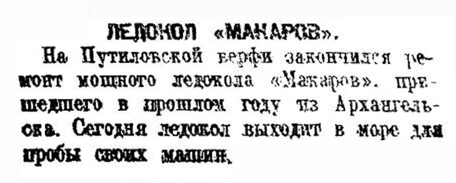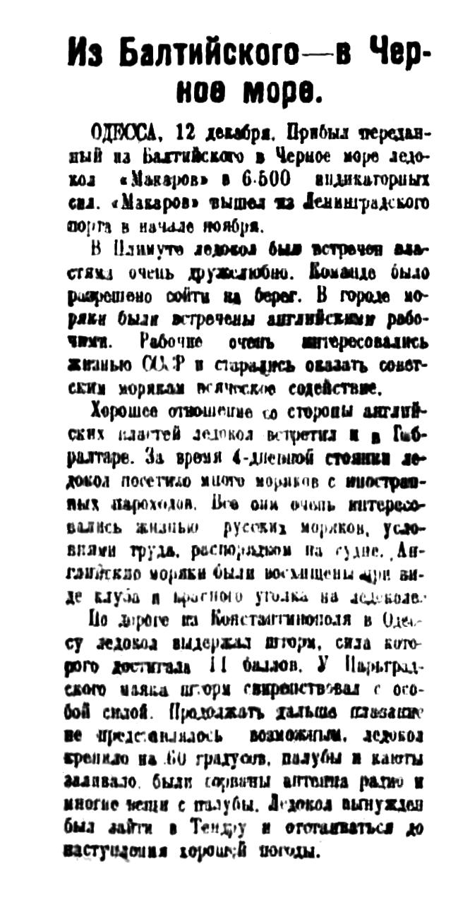 ОДЕССА, 12 декабря. Прибыл переданный из Балтийского в Черное море ледокол «Макаров» в 6.500 индикаторных сил. «Макаров» вышел из Ленинградского порта в начале ноября.