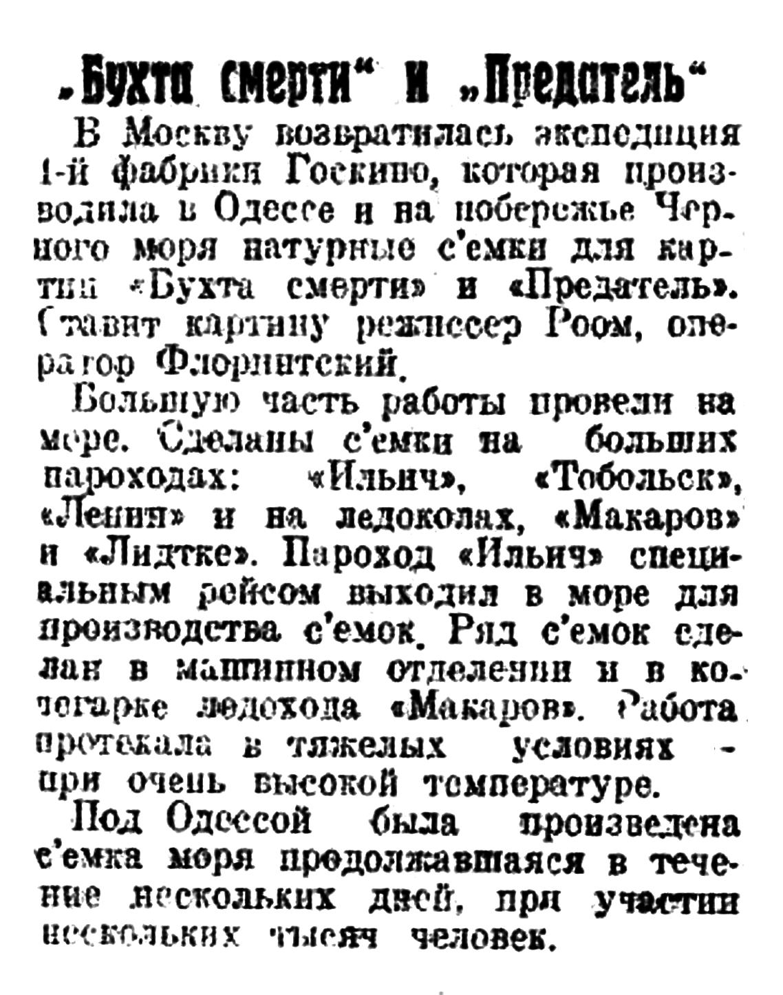 В Москву возвратилась экспедиция 1-й фабрики Госкино, которая производила в Одессе и на побережье Черного моря натурные съёмки для картин «Бухта смерти» и «Предатель». Ставит картину режиссер Роом, оператор Флоринтский.
