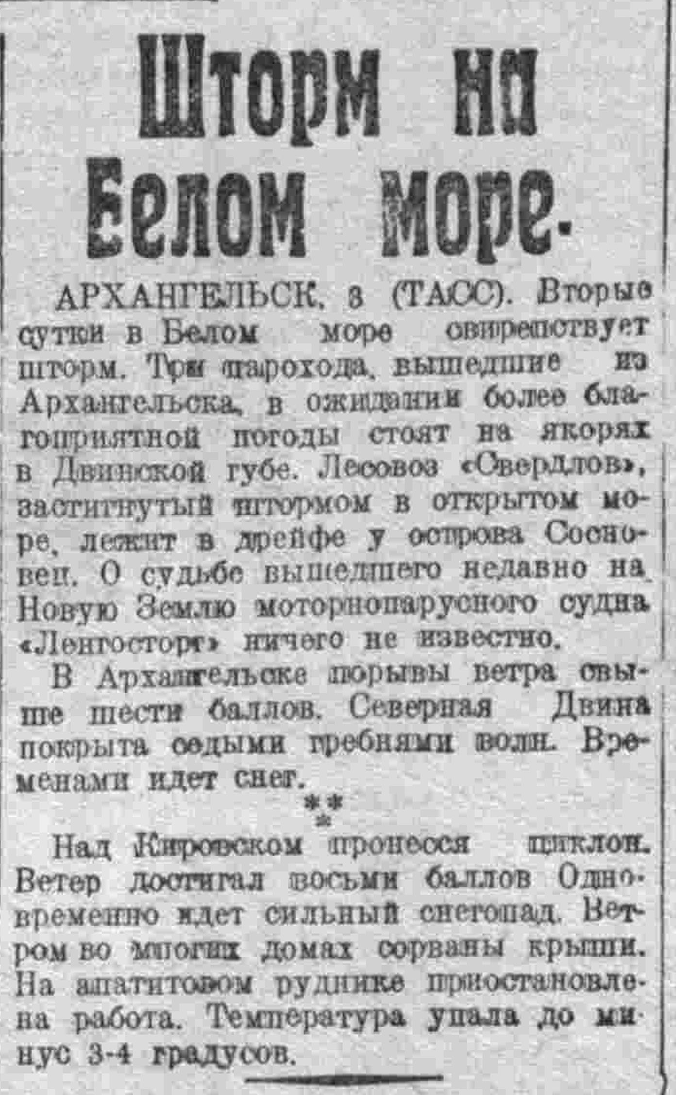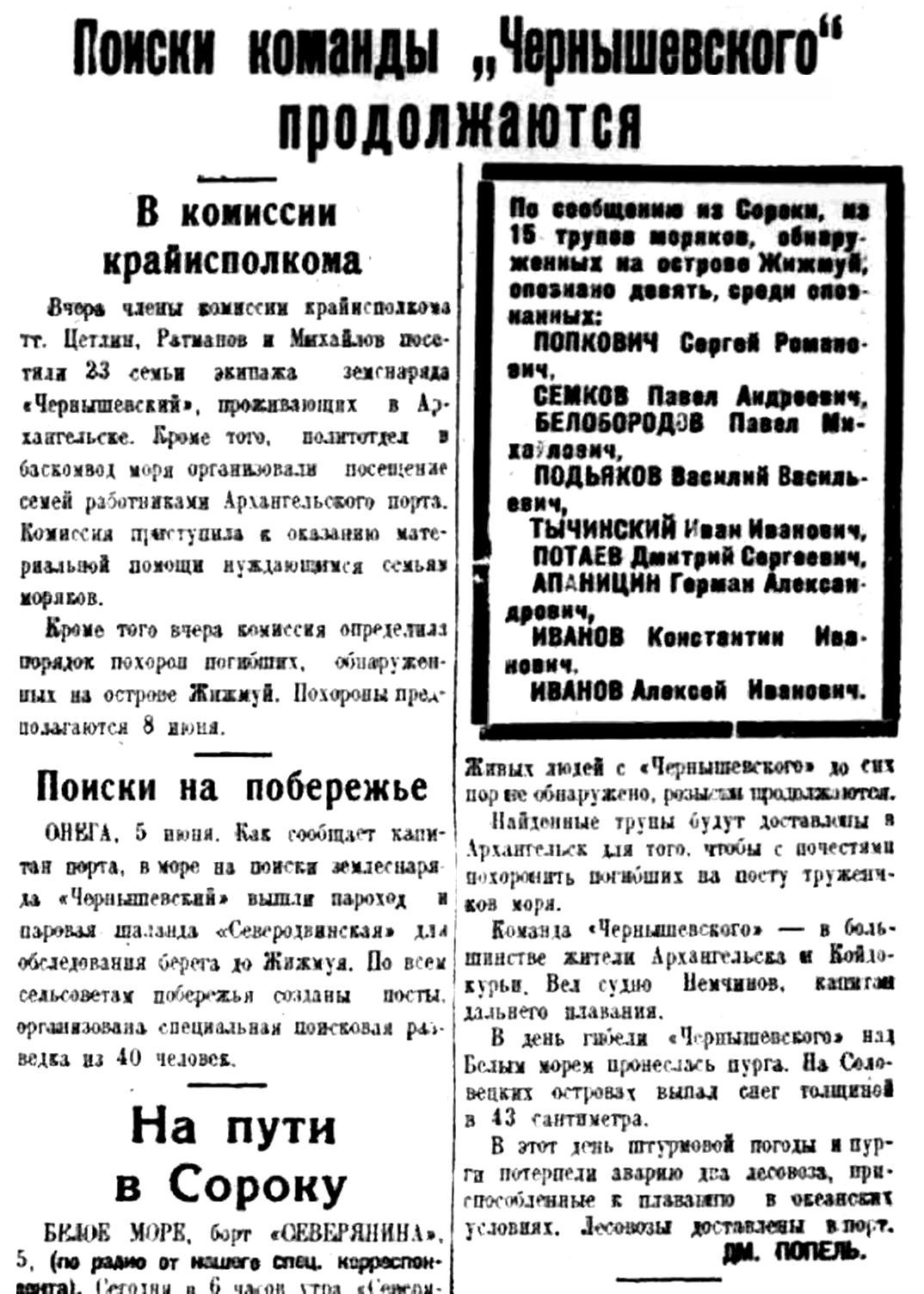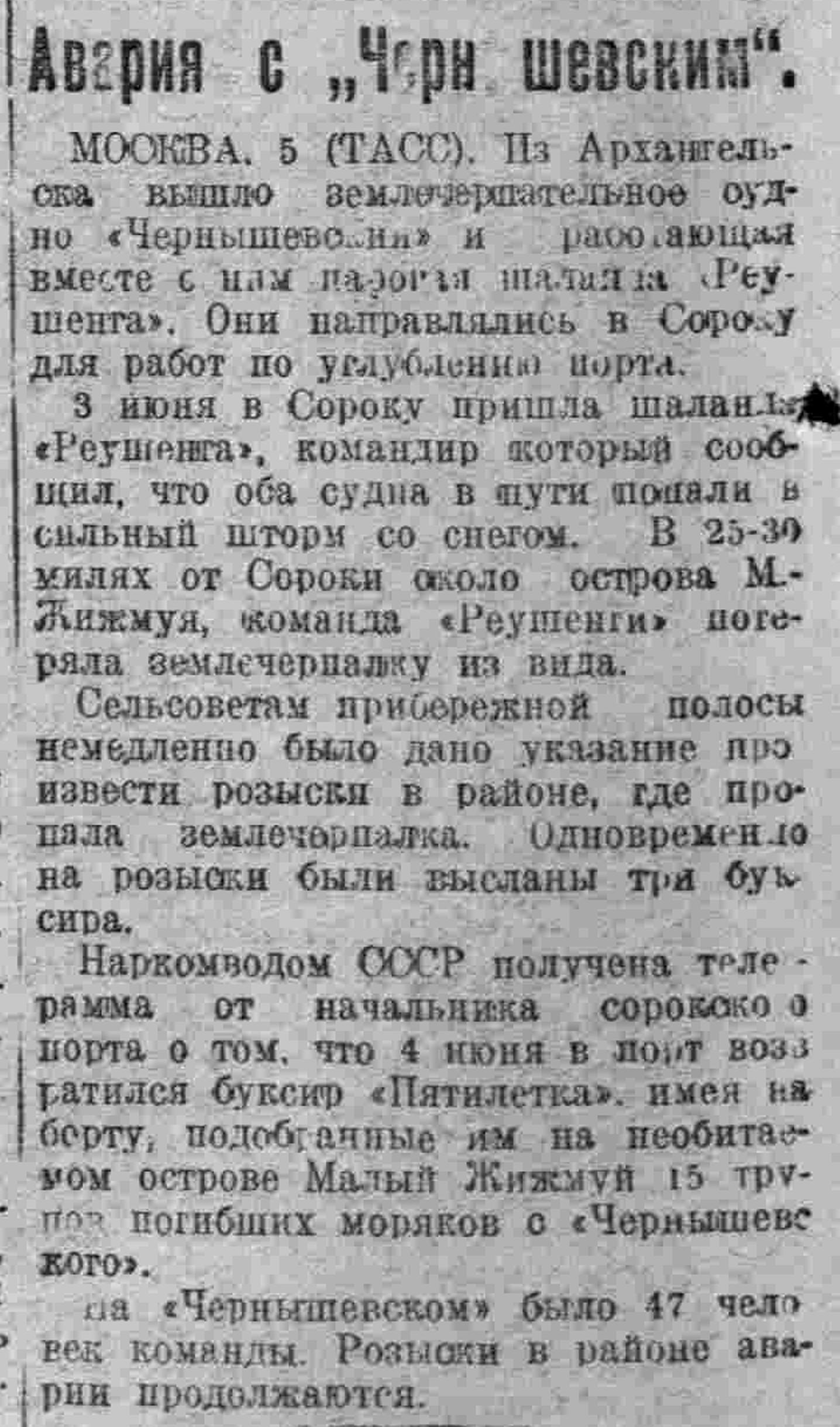 БЕЛОЕ МОРЕ, борт "СЕВЕРЯНИНА". 5, (по радио от нашего спец. корреспондента). Сегодня в 6 часов утра "Северянин", вышедший из Архангельска на розыски "Чернышевского" и для расследования причин аварии, достиг острова Жижгина. На борту "Северянина" комиссия во главе с управляющим Севморфлота тов.