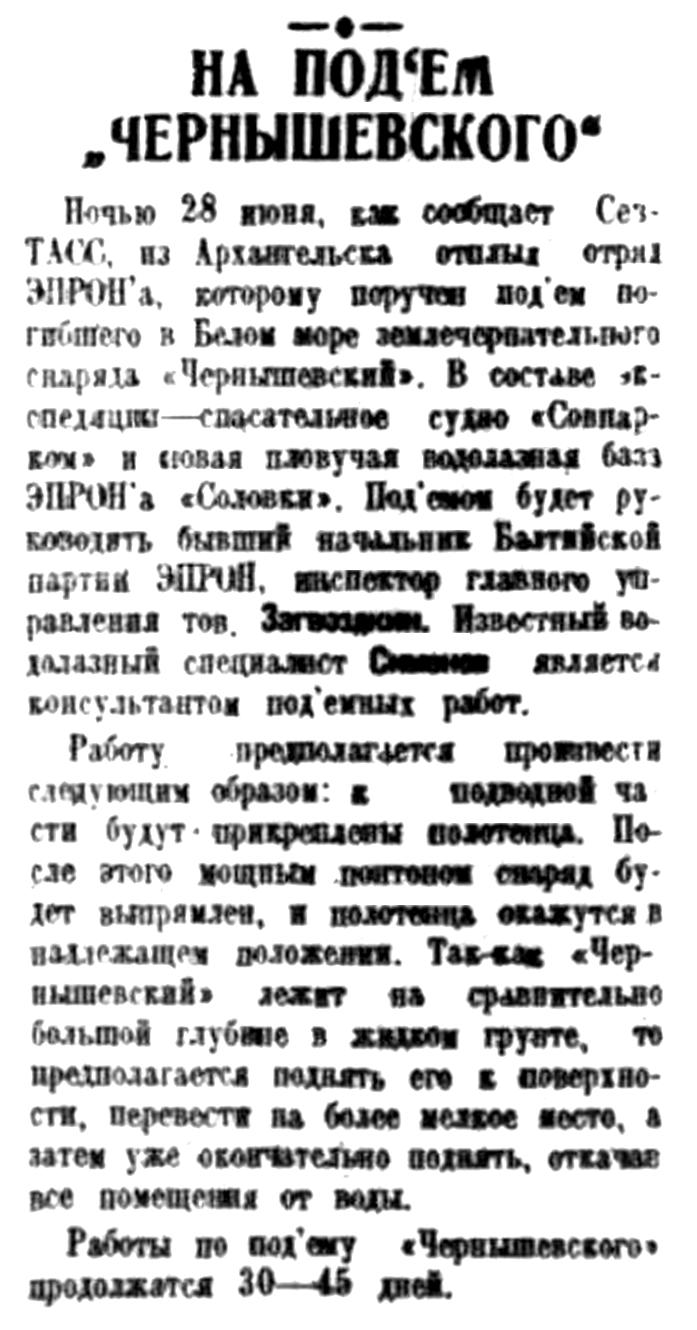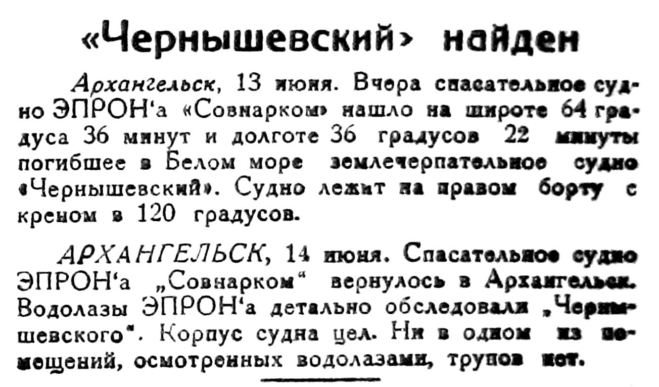 ОНЕГА. 5 июня. Как сообщает капитан порта, в море на поиски землеснаряда "Чернышевский" вышли пароход и паровая шаланда "Северодвинская" для обследования берега до Жижмуя. По всем сельсоветам побережья созданы посты, организована специальная поисковая разведка из 40 человек.
