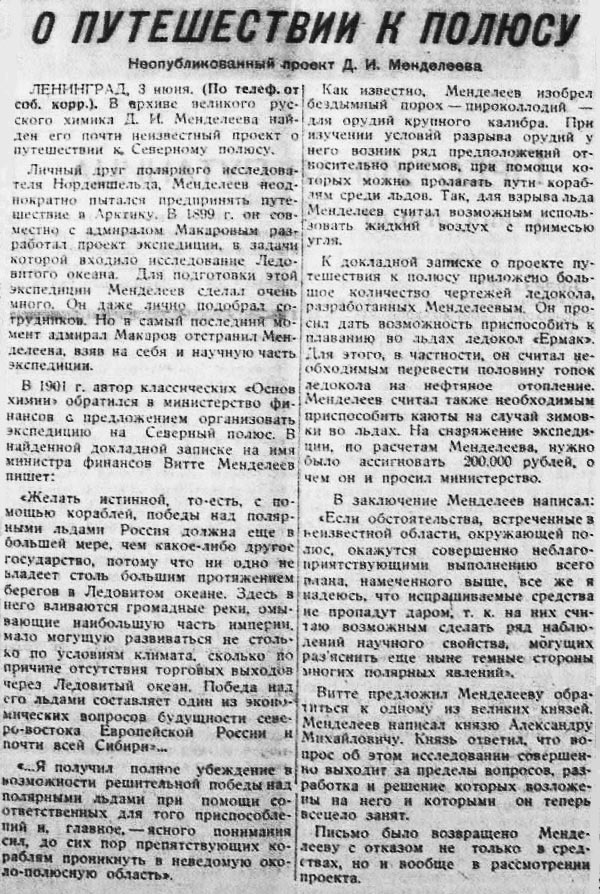 В 1901 г. автор классических «Основ химии» обратился в министерство финансов с предложением организовать экспедицию на Северный полюс. В найденной докладной записке на имя министра финансов Витте Менделеев пишет: