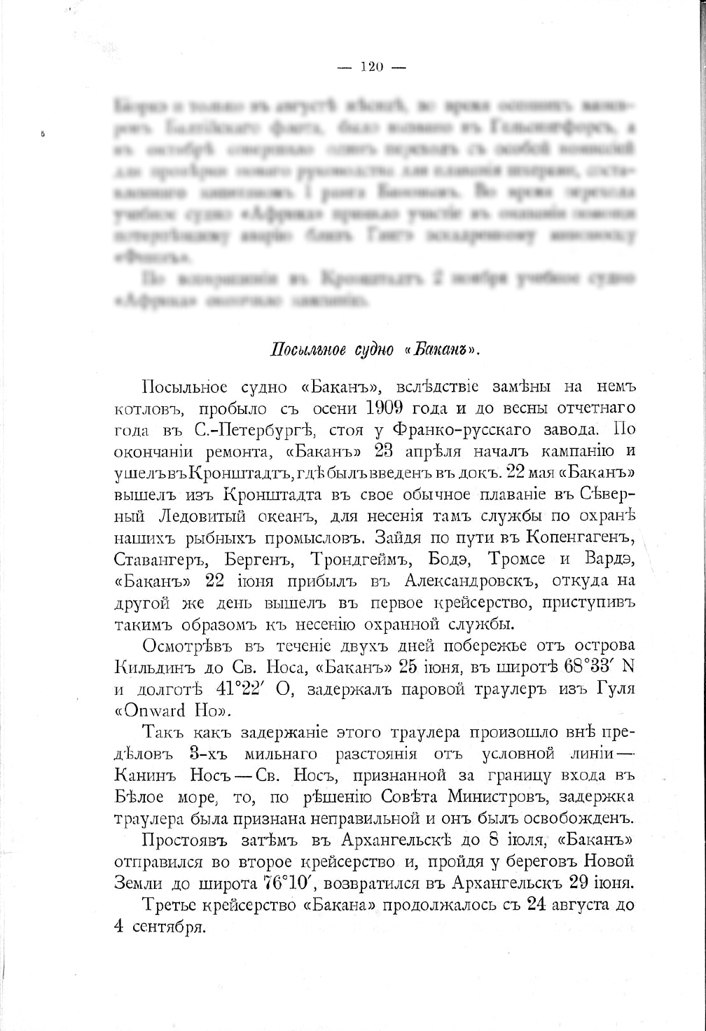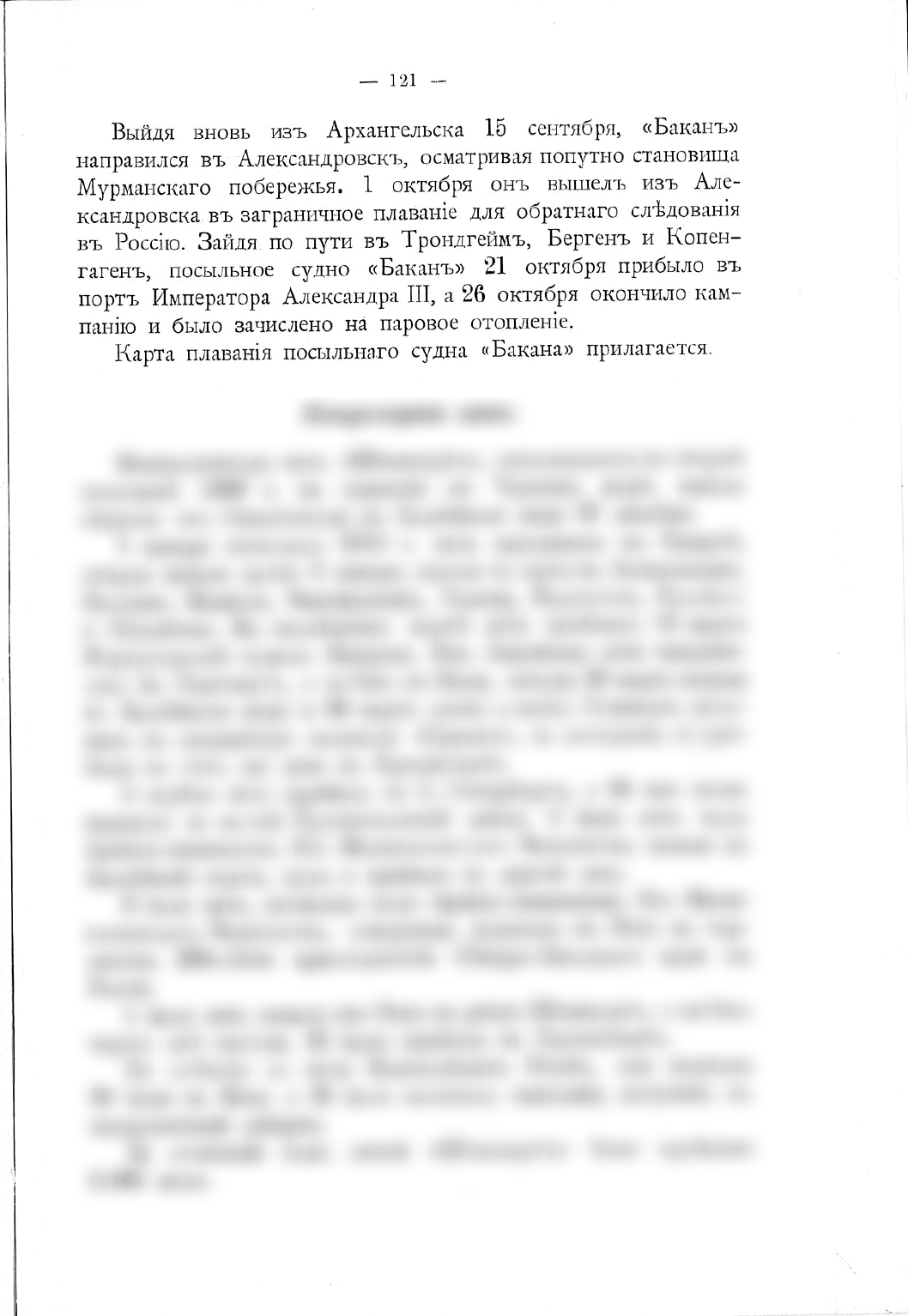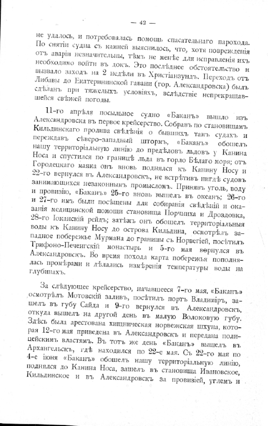 27) Посыльное судно «Баканъ». Посыльное судно «Баканъ», состоя въ началѣ отчетнаго года на паровомъ отопленіи, 20 февраля начало кампанію и 12 марта вышло изъ Порта Императора Александра III въ сѣверный Ледовитый океанъ для несенія тамъ службы по охранѣ нашихъ рыбныхъ промысловъ. Зайдя по пути въ Копенгагенъ, Бергенъ, Трондгеймъ, Тромсе и Гаммерфестъ, «Баканъ» 8 апрѣля прибылъ въ Александровскъ, откуда 14 апрѣля вышелъ въ первое крейсерство, начавъ этимъ несеніе охранной службы. Въ теченіе первыхъ трехъ дней, совершивъ переходъ съ осмотромъ побережья, транспортъ дошелъ до Кольскаго залива, а 17 апрѣля возвратился въ Александровскъ.