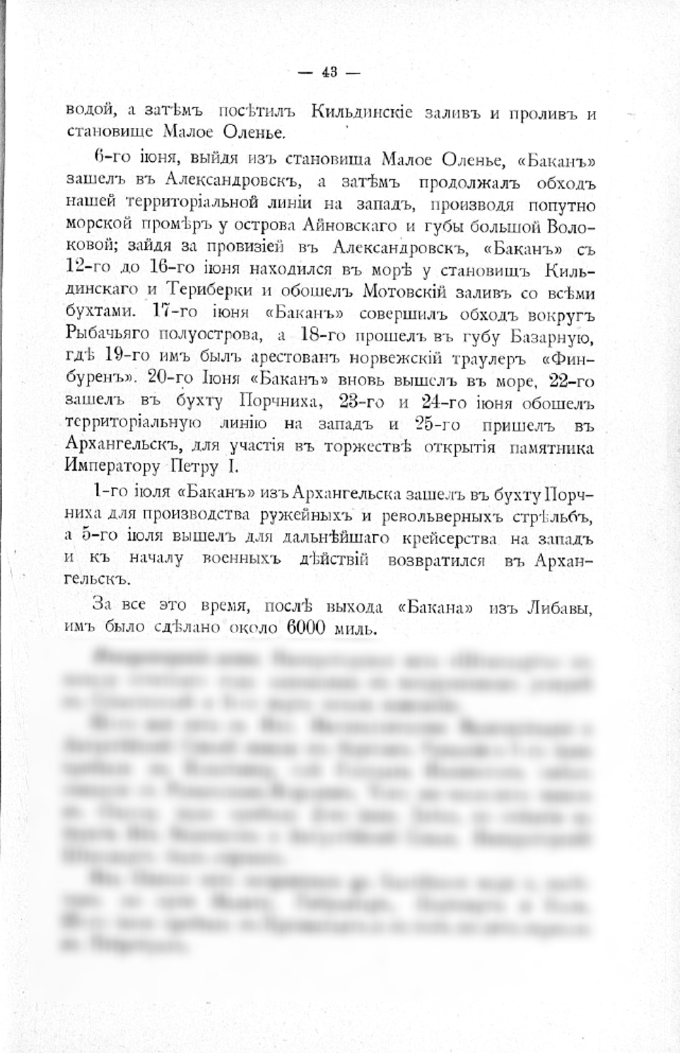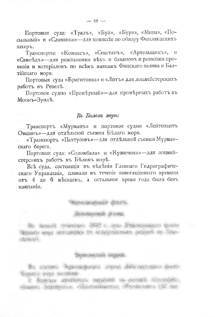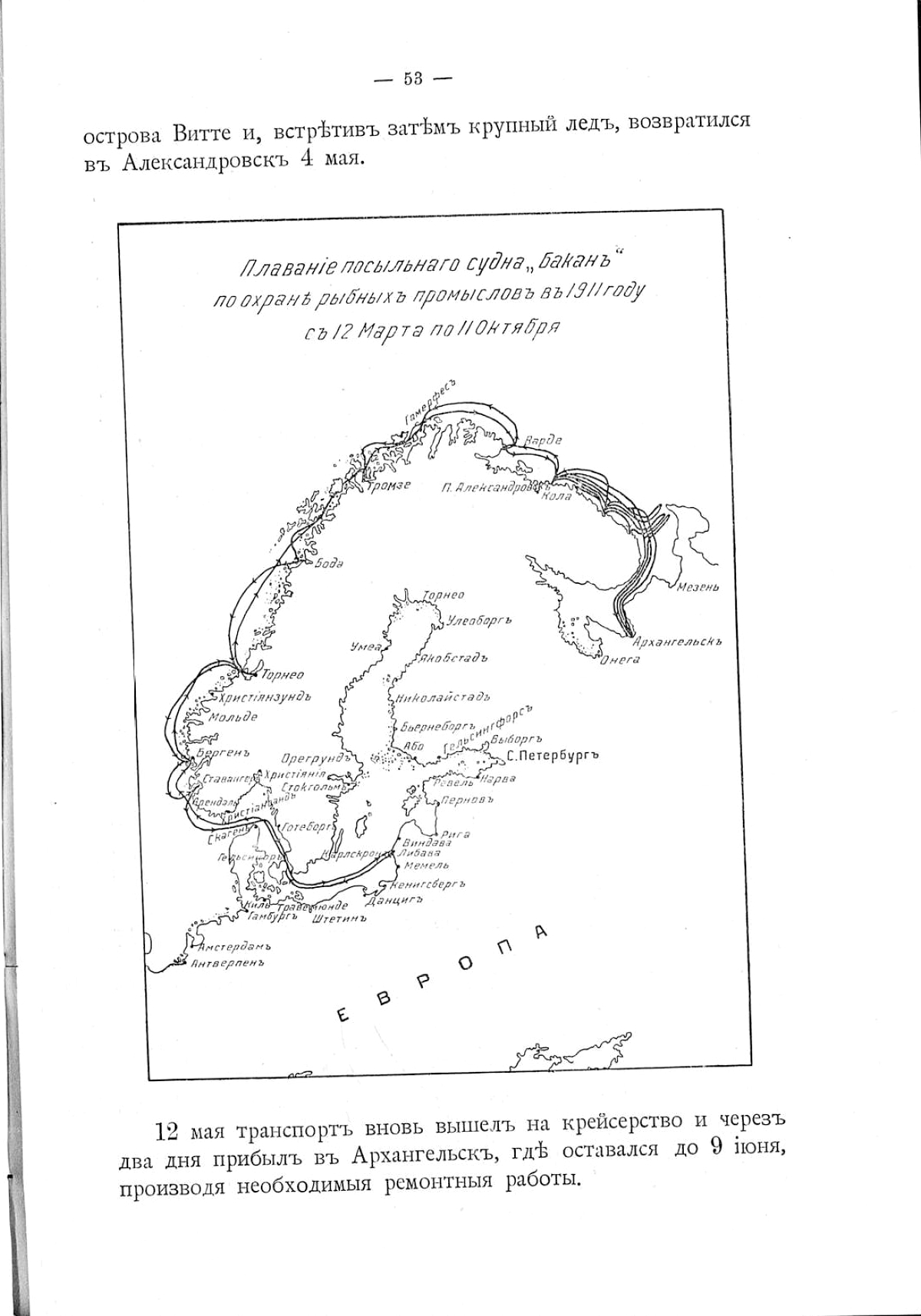 27) Посыльное судно «Баканъ». Посыльное судно «Баканъ», состоя въ началѣ отчетнаго года на паровомъ отопленіи, 20 февраля начало кампанію и 12 марта вышло изъ Порта Императора Александра III въ сѣверный Ледовитый океанъ для несенія тамъ службы по охранѣ нашихъ рыбныхъ промысловъ. Зайдя по пути въ Копенгагенъ, Бергенъ, Трондгеймъ, Тромсе и Гаммерфестъ, «Баканъ» 8 апрѣля прибылъ въ Александровскъ, откуда 14 апрѣля вышелъ въ первое крейсерство, начавъ этимъ несеніе охранной службы. Въ теченіе первыхъ трехъ дней, совершивъ переходъ съ осмотромъ побережья, транспортъ дошелъ до Кольскаго залива, а 17 апрѣля возвратился въ Александровскъ.