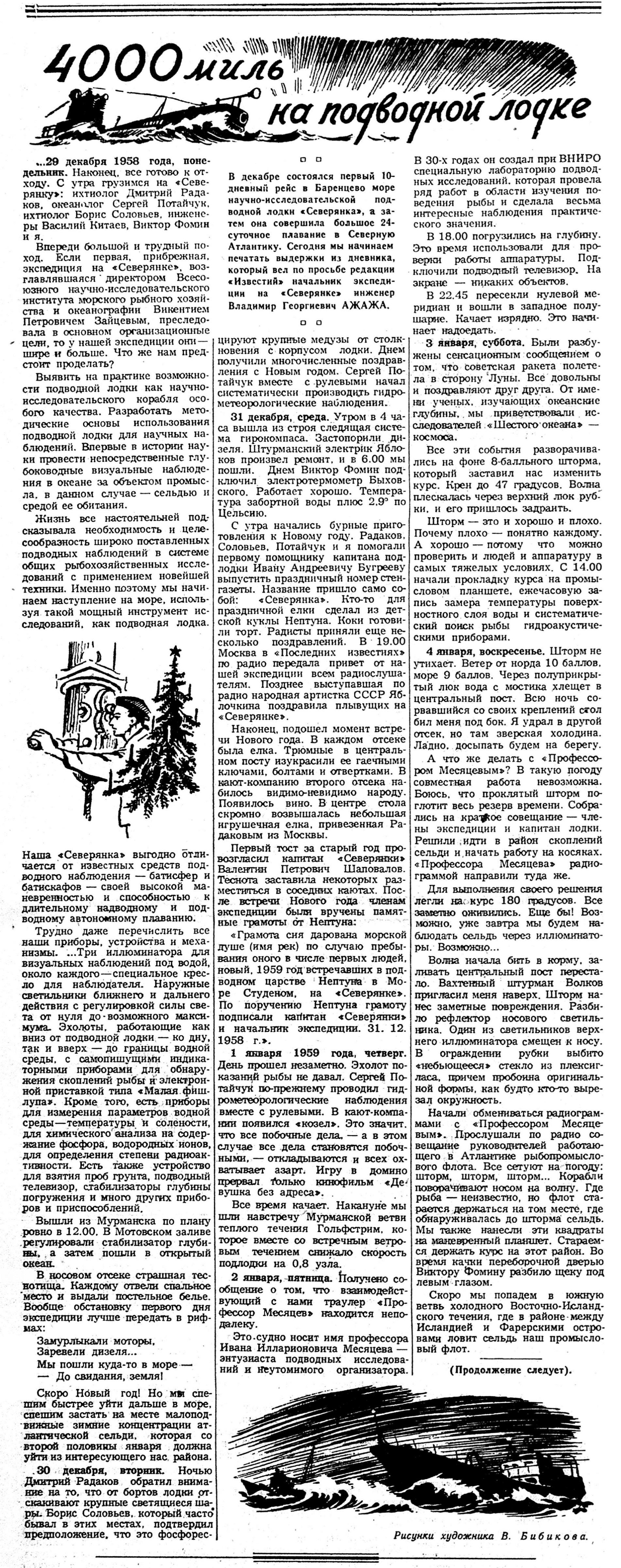 Сегодня мы заканчиваем рассказ о 24-суточном плавании из Мурманска в Северную Атлантику научно-исследовательской подводной лодки «Северянка». В трех предыдущих отрывках из дневника начальника этой экспедиции инженера В.Г. Ажажа, опубликованных в «Известиях» 15, 17 и 18 февраля, повествуется о трудном штормовом походе «Северянки» и о научно-исследовательских работах — день за днем — по 15 января 1959 года.