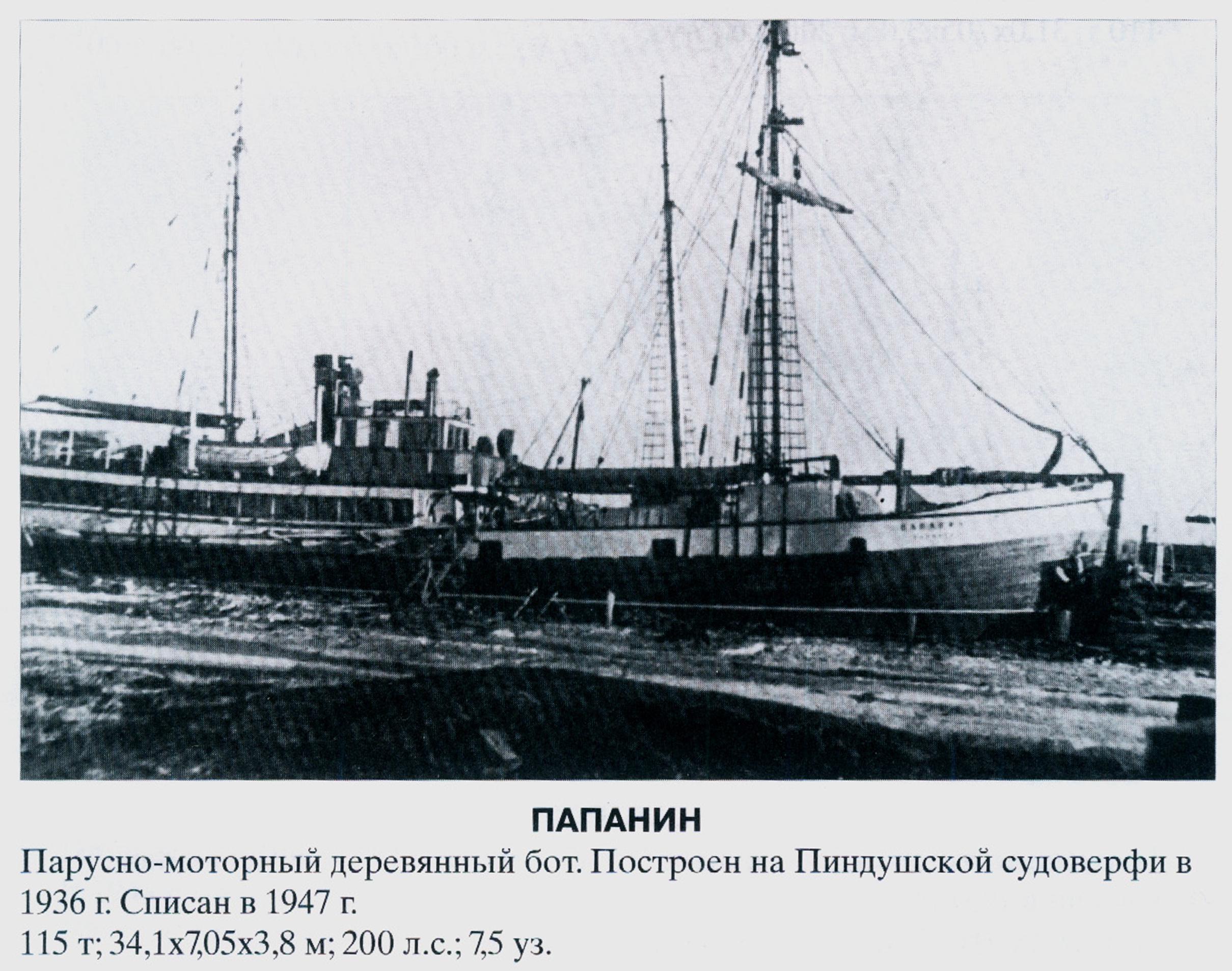 Парусно-моторный деревянный бот. Построен на Пиндушской судоверфи в 1936 г. Списан в 1947 г.