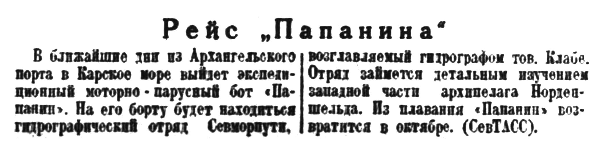 В ближайшие дни из Архангельского порта в Карское море выйдет экспедиционный моторно-парусный бот «Папанин». На его борту будет находиться гидрографический отрад Севморпути, возглавляемый гидрографом тов. Клабе. Отряд займется детальным изучением западной части архипелага Норденшельда. Из плавания «Папанин» возвратится в октябре. (СевТАСС).