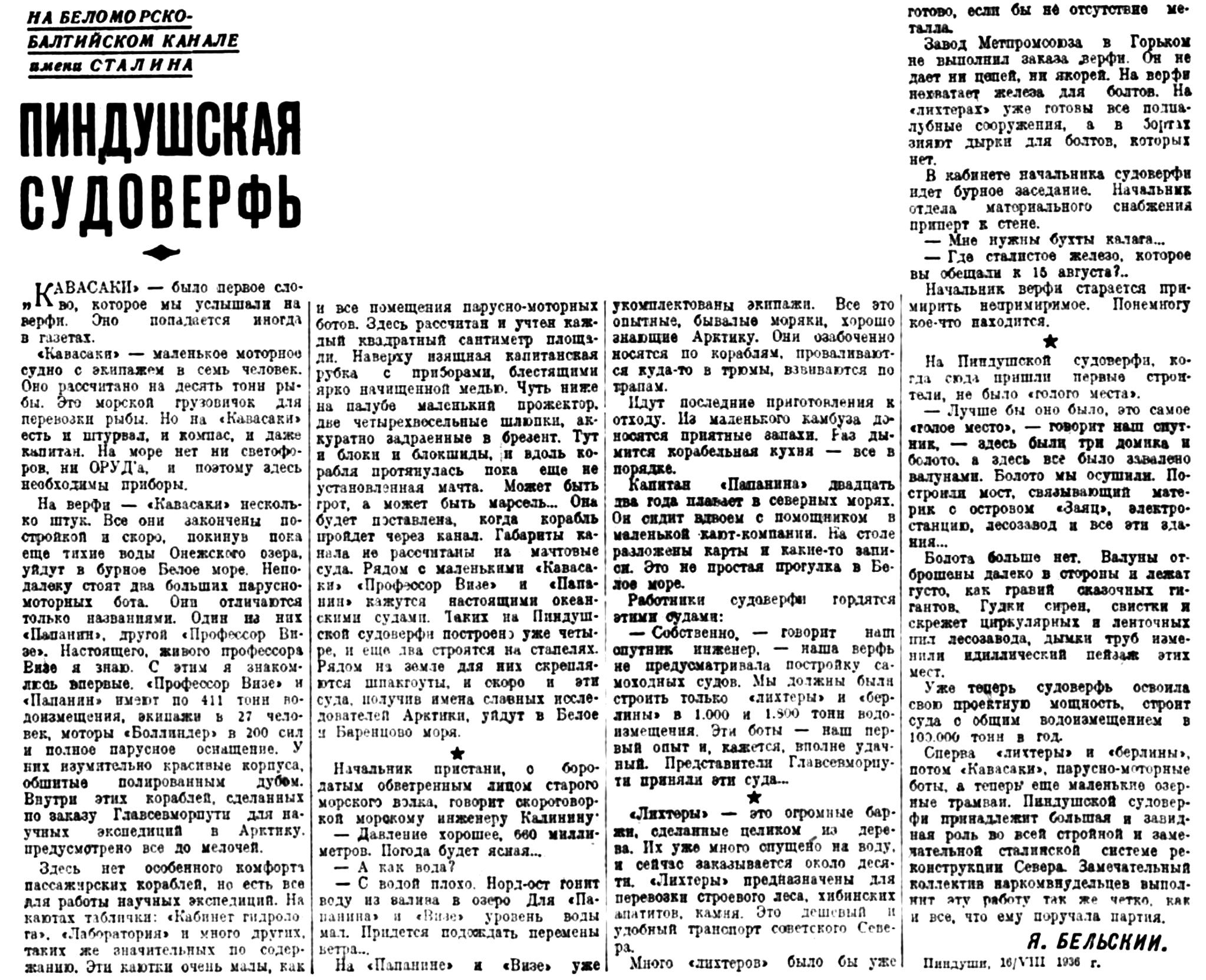 Сперва «лихтеры» и «берлины», потом «Кавасаки», парусно-моторные боты, а теперь еще маленькие озерные трамваи. Пиндушской судоверфи принадлежит большая и завидная роль во всей стройной и замечательной сталинской системе реконструкции Севера. Замечательный коллектив наркомвнудельцев выполнит эту работу так же четко, как и все, что ему поручила партия.
