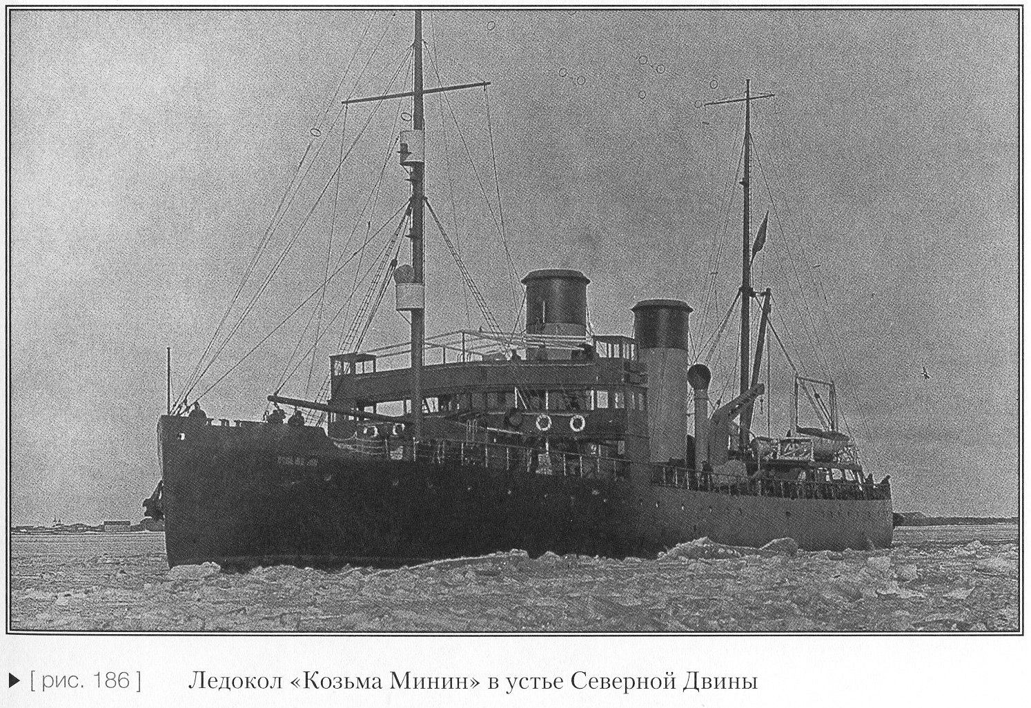 «Козьма Минин» пришел на Северную Двину в конце ноября 1916 г.: первым из ледоколов, заказанных по особой программе 1915 г. Через месяц к нему присоединился «Князь Пожарский». Оба ледокола помогли продлить навигацию в районе аванпорта «Экономия», а затем в апреле 1917 г. начать новую. По плану зимних перевозок только «Минин» смог в январе вывести1 один конвой в Баренцево море, а затем привести к Архангельску другие пароходы. Остальные попытки проводки конвоев большими ледоколами оказались неудачными. Транспортные операции на Севере в зимние навигации 1917 1918 и 1918-1919 гг. проводились в ограниченном объеме, причем последняя осуществлялась под руководством англичан. Только в зимой 1919/20 г. ледокол сыграл свою историческую роль. В феврале 1920 г. на нем осуществлялась эвакуация руководства белых на Севере во главе с генералом Миллером из Архангельска в Норвегию. «Козьма Минин» даже отбился от снаряженной за ним в погоню «Канады», принадлежавшей красным.