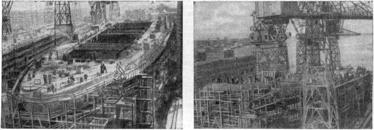 Объемные секции весом до 80 т изготавливались на участках предварительной сборки, а затем в готовом виде подавались на стапель.