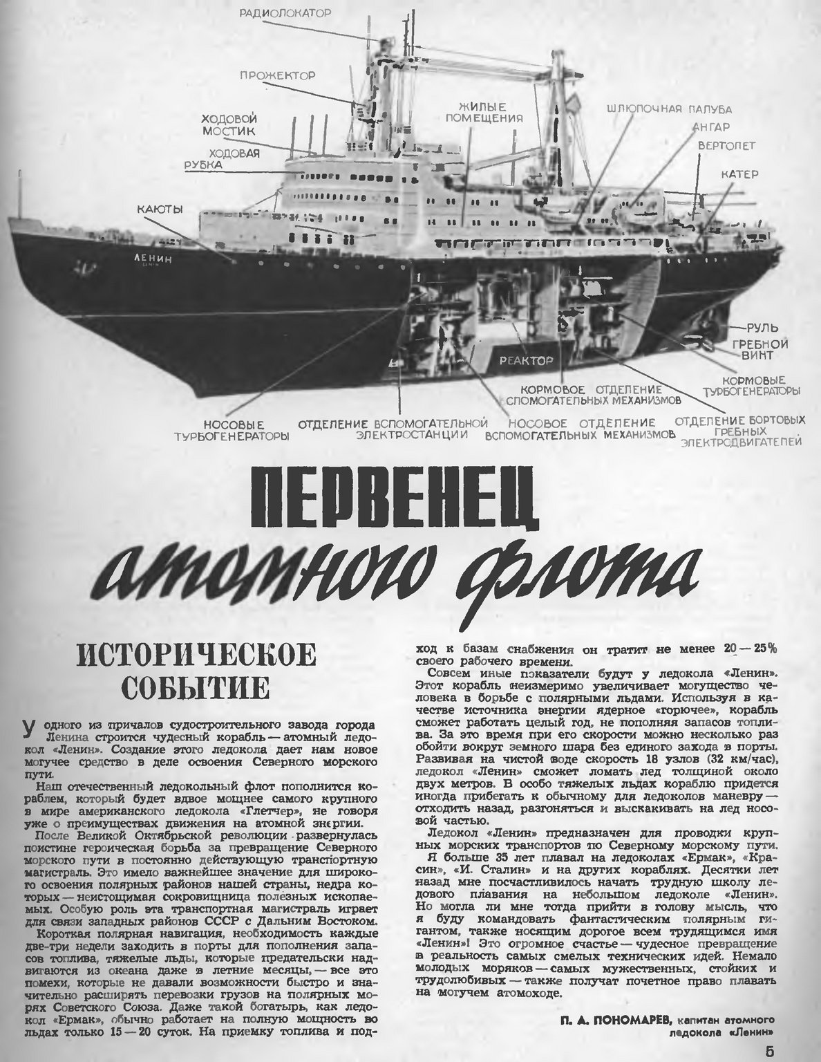 Этот корабль неизмеримо увеличивает могущество человека в борьбе с полярными льдами. Используя в качестве источника энергии ядерное «горючее», корабль сможет работать целый год, не пополняя запасов топлива. За это время при его скорости можно несколько раз обойти вокруг земного шара без единого захода в порты.