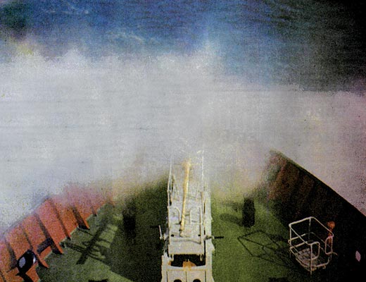 Льды кончились, и «Отто Шмидт» вышел на чистую воду, встречая крутую волну. Ветер в снастях не просто поет — гудит. Ледокол медленно раскачивается с носа на корму. От удара носовой части о волну вздымается стена брызг, достигающая ходового мостика. Вода белой пеной лезет через якорные клюзы на палубу. Поднятый занавес вспененной воды в ярких лучах низкого осеннего солнца становится ярко-белым. После каждой такой вспышки, освещающей через носовые иллюминаторы кают-компанию, водяная стена с шумом обрушивается на носовую надстройку. Арктическая вахта «Отто Шмидта» продолжается.