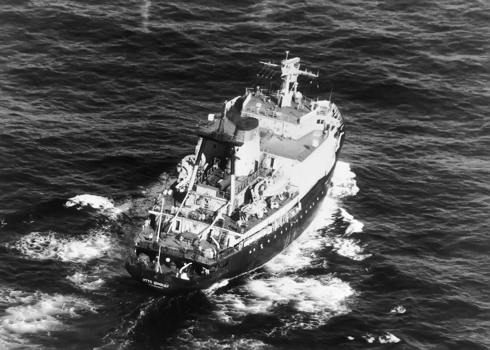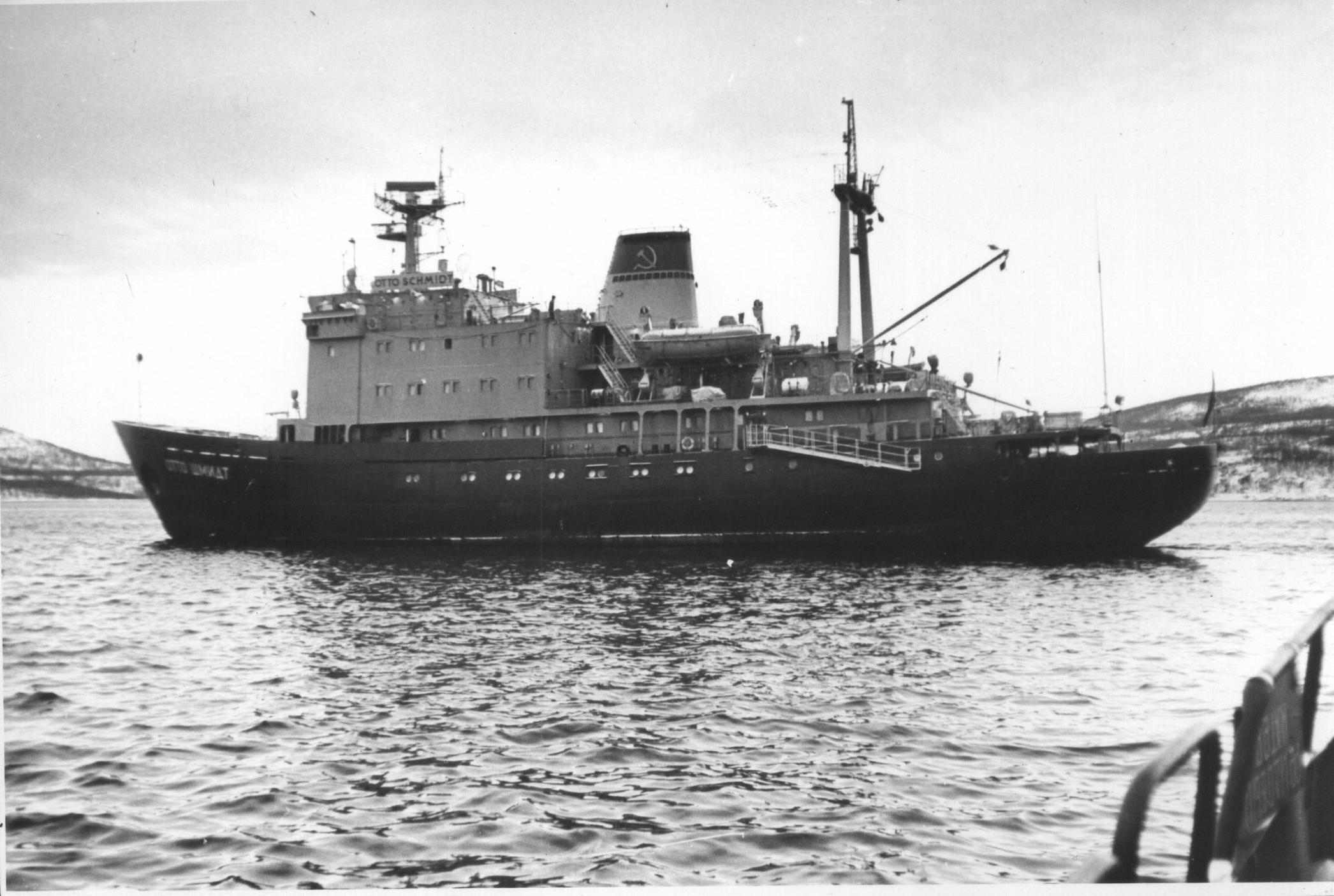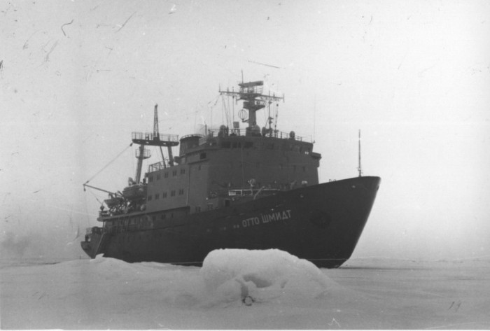 На траверзе мыса Кользат на широте 81° встретили сплоченные тяжелые льды, для преодоления которых мощности нашего ледокола было недостаточно. Личный рекорд «Отто Шмидта» — 83° 54' — был поставлен еще в первом экспериментальном рейсе в сентябре 1979 года. Символично, что плавание проходило в том же районе, где полвека назад, в августе 1929 года, экспедиция на ледокольном пароходе «Георгий Седов» под руководством Отто Юльевича Шмидта достигла рекордной для того времени широты в свободном плавании — 82° 14'.